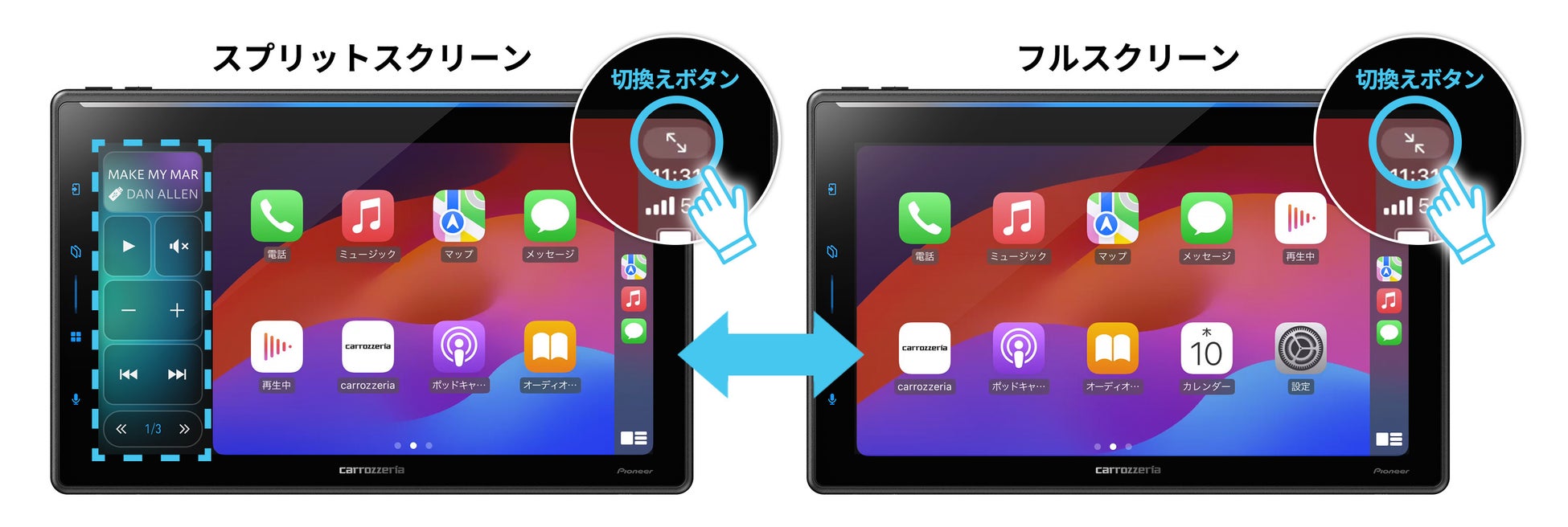 ・ 「Apple CarPlay」使用時、同一画面上に本機や対応アプリを操作するショートカットキーを表示する「スプリットスクリーン」を搭載※3。切換えボタンをタップするだけで簡単にスクリーンモードを変更でき、画面を遷移することなく、スムーズに目的の操作を行えます。
