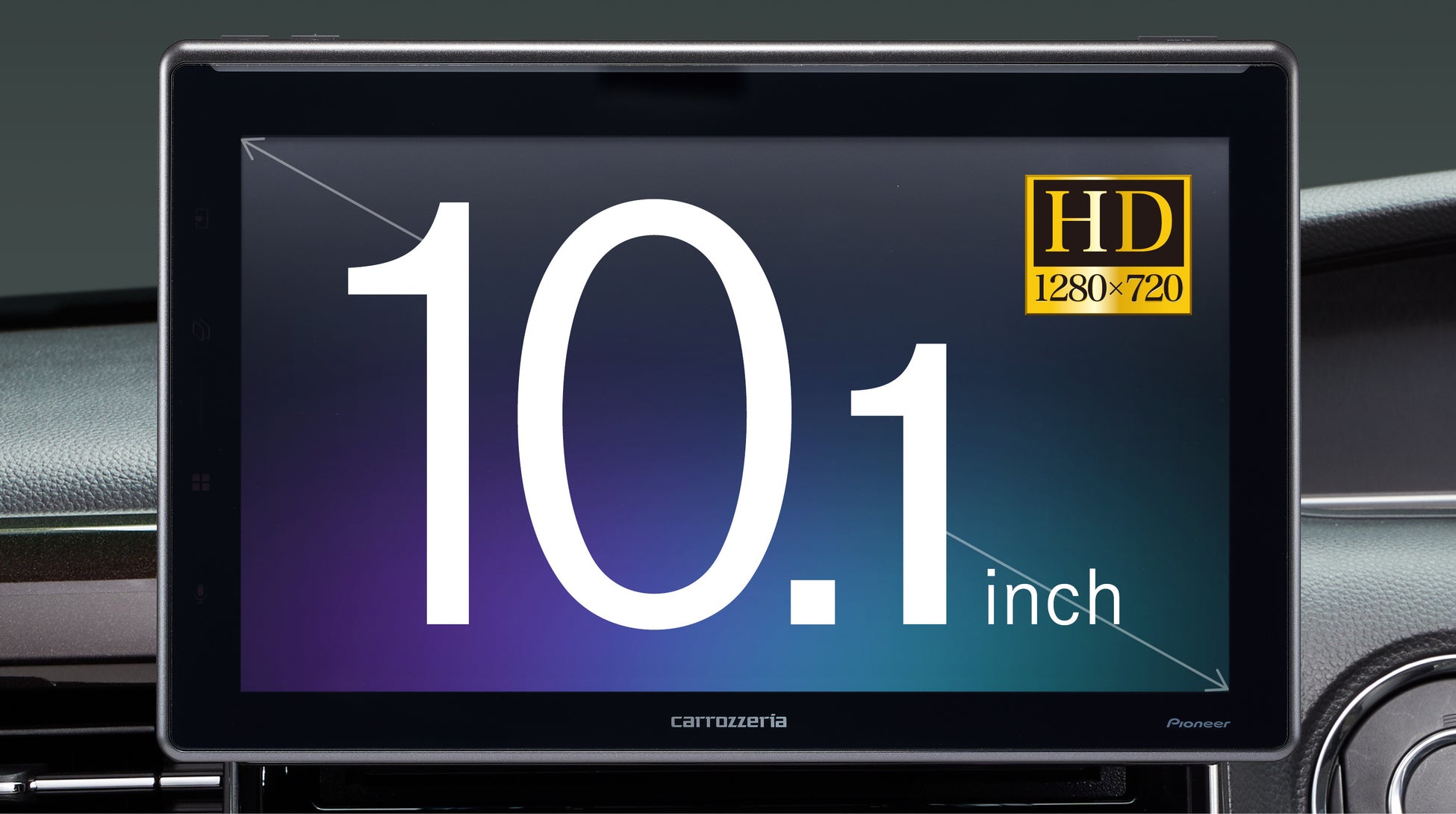 1DINサイズのフローティング構造により、10.1 インチの大画面モデルを幅広い車種(392車種)に取り付けることができます。高解像度(2,764,800画素)なHDパネルの採用に加え、視野角の広いIPS方式と黒色再現性に優れたNormally Black方式を採用。高透過率の静電容量方式タッチパネルや高輝度LEDバックライトを組み合わせることで、鮮明かつ高コントラストな映像表現を実現しています。HDMI®入力にも対応しているため、スマートフォンの映像を高画質で再生可能です。