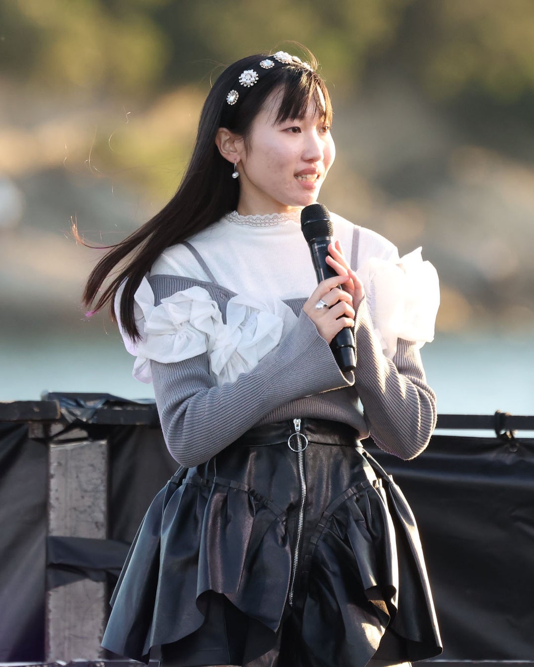 トークステージでは、米澤りあが「お花のモチーフで生地がたっぷりの衣装で、お花畑を歩いているイメージでした!お客さんも温かくて景色も最高!また来たいです!」、石川悠人が「シルエットがとてもきれいで奇抜なデザインがプラスに働いていてとてもおしゃれ。沢山の方が見に来てくれてとてもうれしいです!」と衣装を着用した感想を述べ、鶴嶋乃愛は、「とてもボリュームのあるドレスで肌に触れるたびにとても心地よく着心地がいいです!この衣装で眠れそう!」と衣装の着心地を語りました。瀬川陽菜乃は「海がキラキラしていて、普段このように海が近いところでイベントに参加することがないので、思わず写真をいっぱい撮りました!愛知県は元々大好きなんですが、蒲郡市は初めて訪れたので、また友達と来たいです!」と景色について語り、小國舞羽は「自然がきれいで癒やされました。竹島の八百富神社が縁結びのご利益があると聞いて今度また行ってみたいです!」、ゆい小池(ゆいちゃみ)は「蒲郡市のご当地ケータリングがめちゃめちゃ美味しかったです!水族館が見えて、行ってみたいなと思いました!」とケータリングで提供された蒲郡のグルメや会場周辺の様子について語りました。