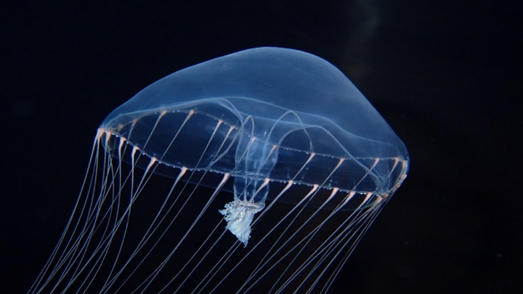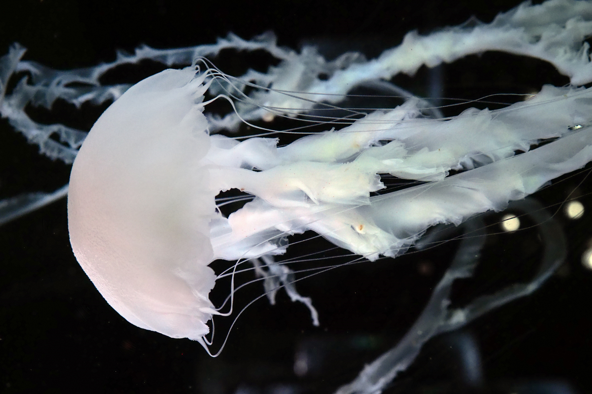 幅約9m×奥行約35m におよぶ広大なクラゲ展示空間。8 つの水槽が並び、「ミズクラゲ」をはじめ常時7~8種の多彩なクラゲをご覧いただけます。生きものの美しさを引き立てる音と光の演出も「フラワーアクアリウム」仕様に。