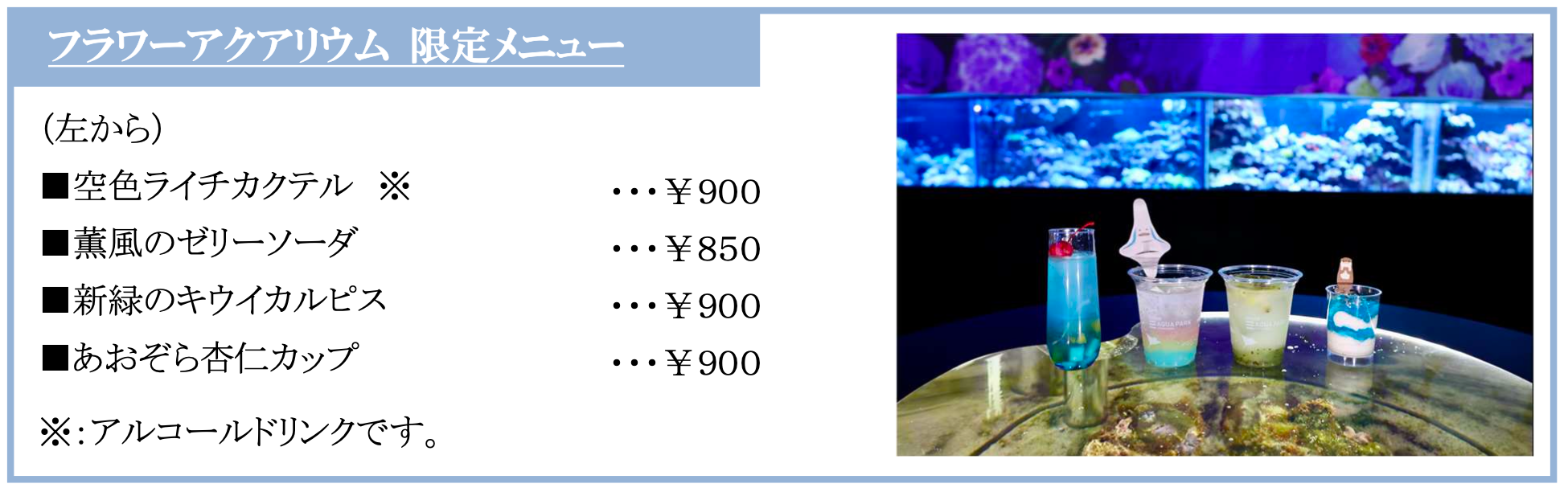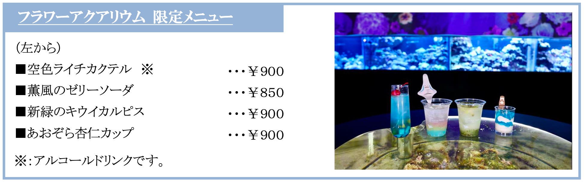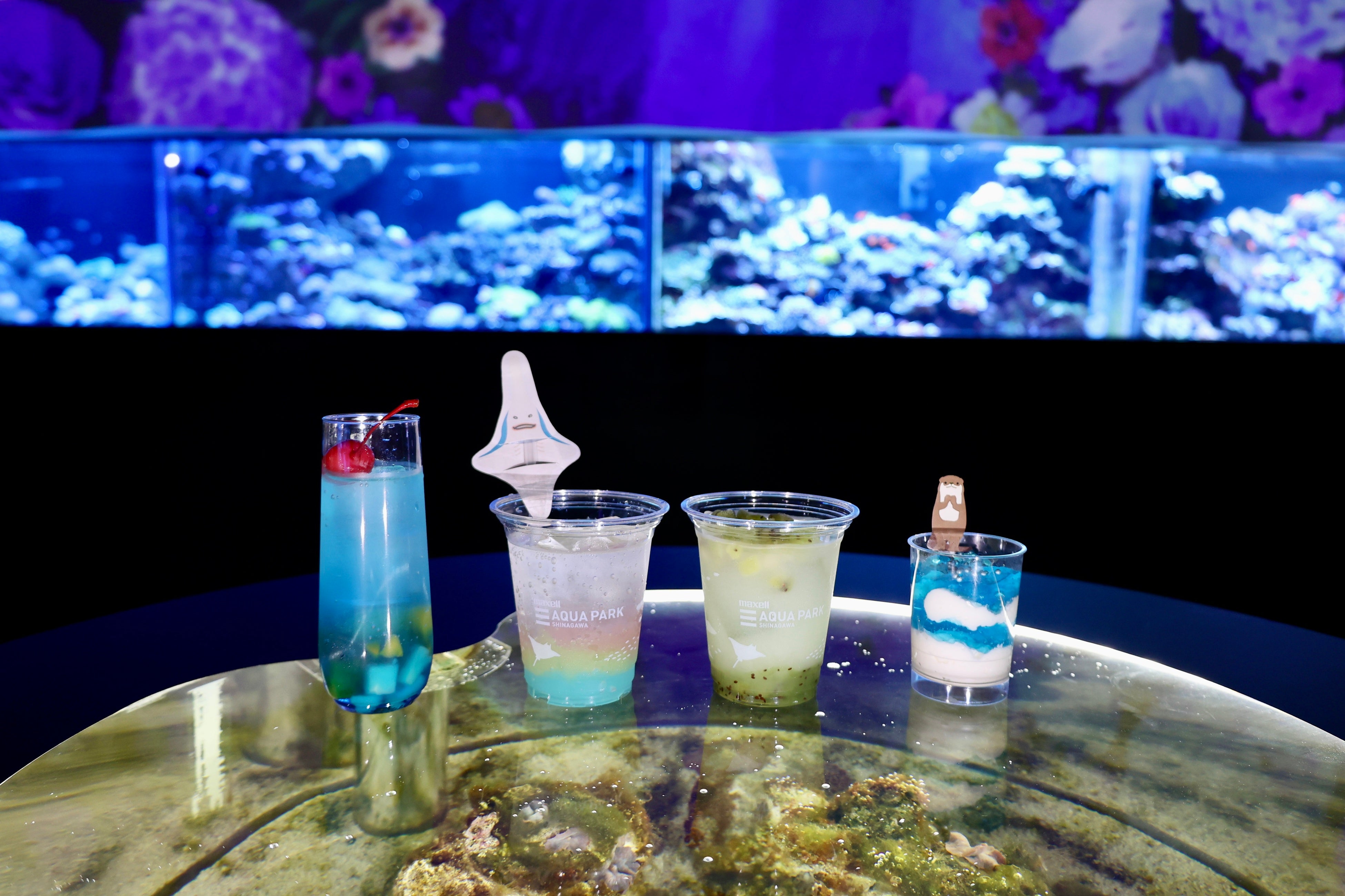 発光サンゴの水槽と初夏の花々が彩る“ガーデンカフェ”。庭園を照らす柔らかな日差しが描かれ、カウンター近くに並ぶ2つの円柱水槽にはホワイトパラソルを設置。涼やかでエキゾチックな空間を演出します。ライチ風味のカクテルやキウイ風味のドリンクをはじめ、初夏の涼しげな青空を表現したスイーツなど4種類のフラワーアクアリウム限定メニューをご用意。なお、ご購入いただいた商品は館内でのお持ち歩きが可能なので“庭園散策”のお供にオススメです。