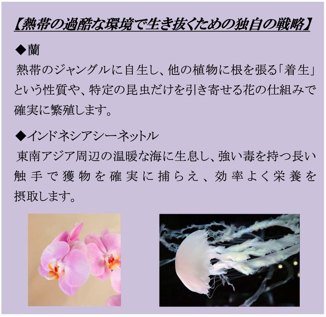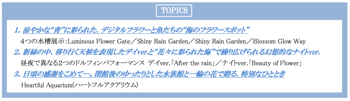 色彩豊かな花々とみずみずしい新緑、そして光に満ちた初夏。当館ではこの季節ならではの魅力をより鮮やかにお楽しみいただけるよう、涼やかな“青”を基調に初夏の花々が咲き誇る幻想的な“海の世界”を描き出します。全天候型施設の特性を活かし、暑さや紫外線、梅雨等の雨天時でも天候を気にせず快適にお過ごしいただける、“生きもの×お花”の唯一無二のエンターテインメントを創出します。