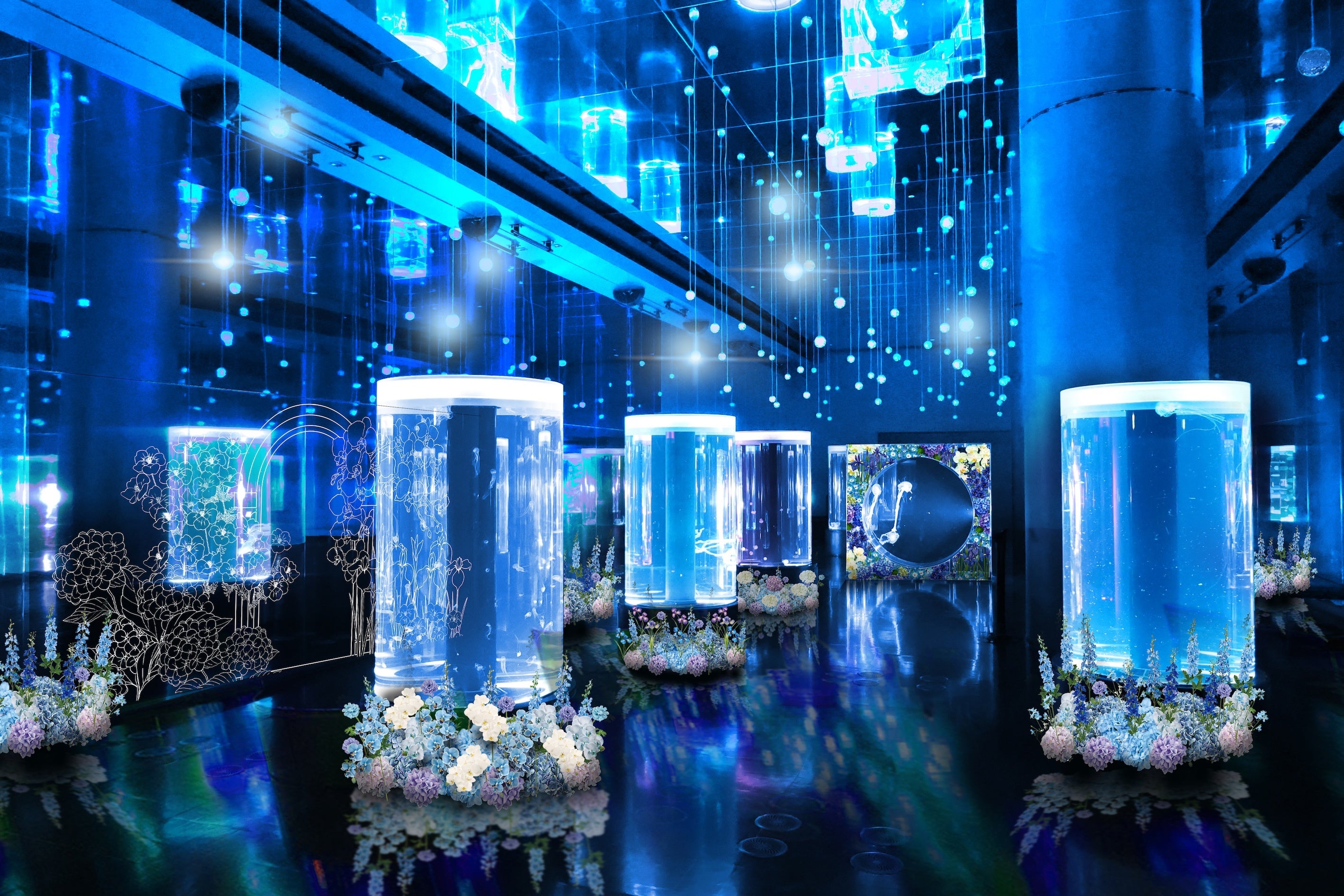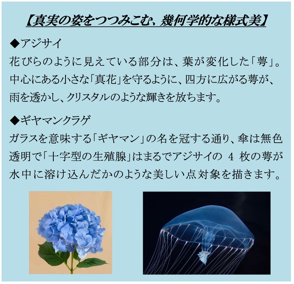 また、今年は日比谷花壇とのコラボレーションにより、“クラゲ×初夏の花々”が空間を鮮やかに彩ります。例えば、透明な傘に十字模様が浮かぶ「ギヤマンクラゲ」の水槽には、花びらのように見える萼(がく)が広がり中心の真花(しんか)をつつむ「アジサイ」を組み合わせた装飾を施しています。無色透明の傘に浮かぶ十字型の生殖腺がアジサイの4枚の萼を思わせる造形と呼応し、水中に溶け込むような美しさを描き出します。これらの組み合わせにより、クラゲと花が織りなすコラボレーション水槽が広がります。さらに、鏡面にはクラゲと花々のイメージをあしらったフォトスポットも登場。
