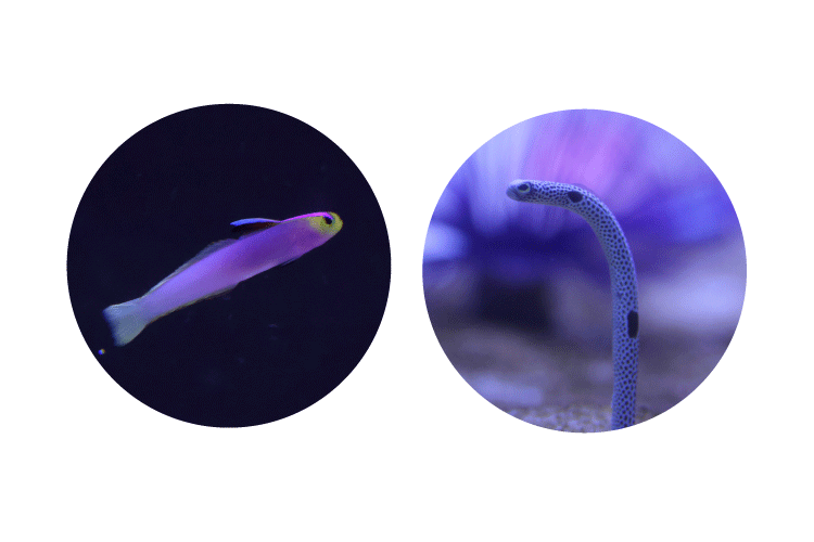 鮮やかな藤の彩りに寄り添うように、7つの小水槽には「シコンハタタテハゼ」など藤を思わせる紫色の魚たちを展示し、やわらかな彩りの中でその美しさが際立ちます。さらに、「チンアナゴ」や「ハナヒゲウツボ」のように空を仰ぐしぐさが印象的な生きものたちが加わり、見上げる動きが情景に広がりをもたらします。天井一面に広がる藤棚の装飾や、花びら舞う水中を表現した壁面、ショウケースのフラワーアートが空間を彩り、初夏の風に揺れる藤棚を見上げるような情景を描き出します。