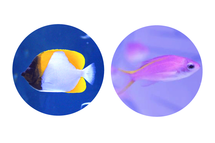 エントランスに描くのは初夏の花々が一同に咲く、壮麗なフラワーゲート。上部には藤が揺れ、アジサイや薔薇、アネモネなどが柔らかなアーチを形成。そして、ゲストの足元を照らすように花の隙間からは光が差し込み、フロア面に木漏れ日を届けます。中央の水槽は、花の香りに誘われる“蝶”を”イメージした“チョウチョウウオ”のなかま「カスミチョウチョウウオ」、鮮やかな紫色が美しい「パープルクイーンアンティアス」、を展示。それぞれ美しく舞い泳ぎながら、この先に広がる“花咲く海の庭園”へゲストを誘います。
