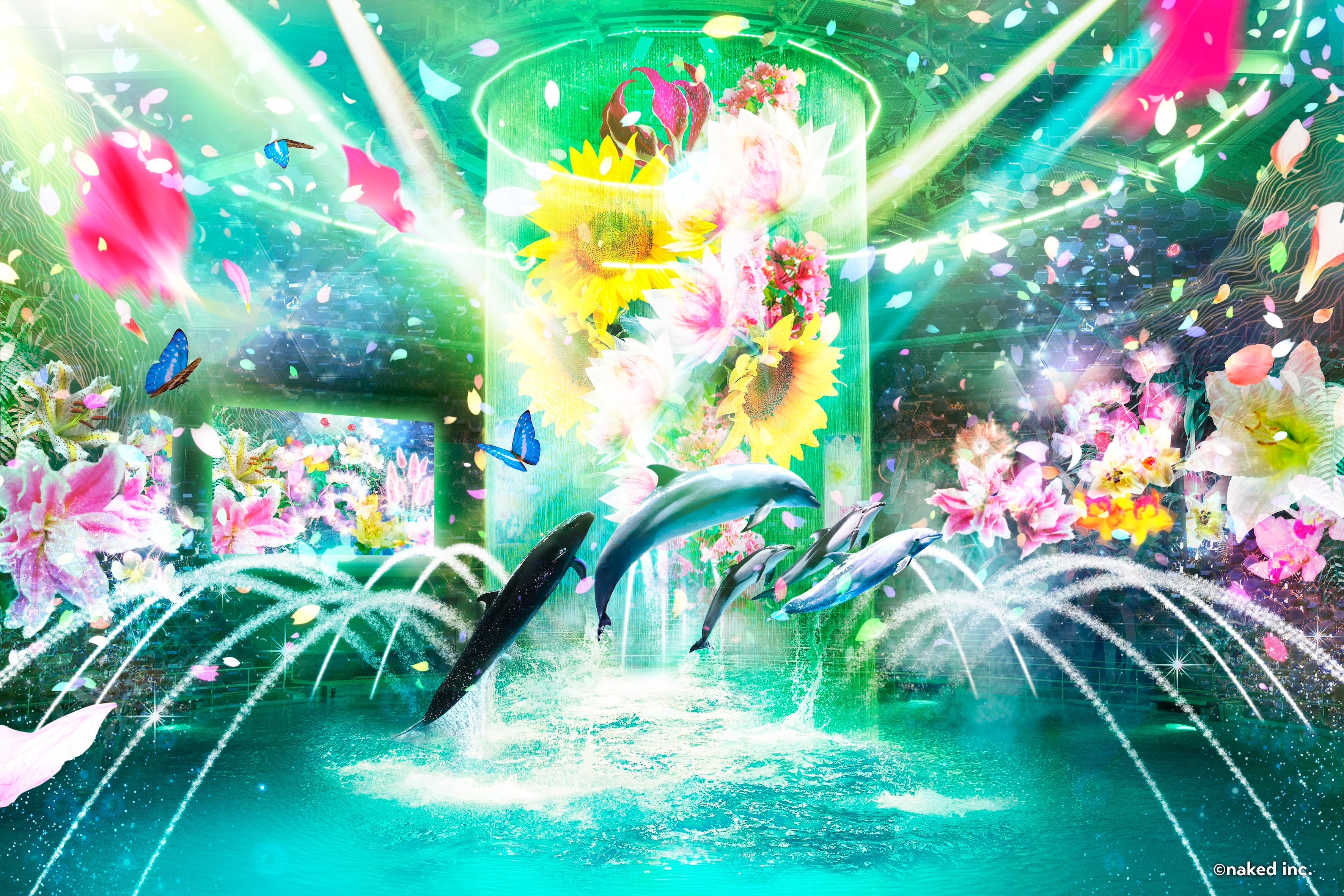 花が咲き、蝶が舞う、光あふれる舞台でイルカたちが躍動するナイトパフォーマンス。【水(噴水、ウォーターカーテン)】 ・【光(ムービング