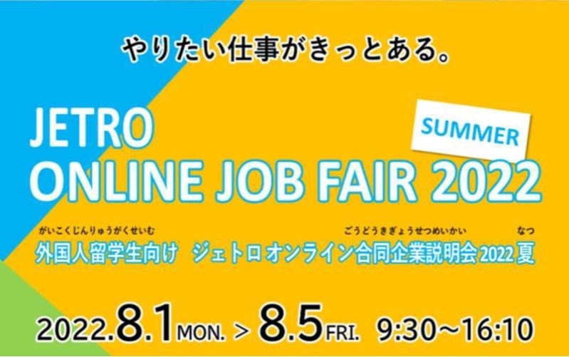 独立行政法人日本貿易振興機構(ジェトロ)が主催し文部科学省と厚生労働省との共催で、国内最大級の外国人留学生向け採用イベント「ジェトロ オンライン合同企業説明会 2022夏」を8月1日(月)より5日間開催します。国内37都道府県に所在の中堅・中小企業約126社が参加します。 本事業を通して、グローバル人材不足に悩む地方企業の高度外国人採用支援に力を入れるとともに、企業と外国人留学生等の高度外国人材の出会いの場を創出します。