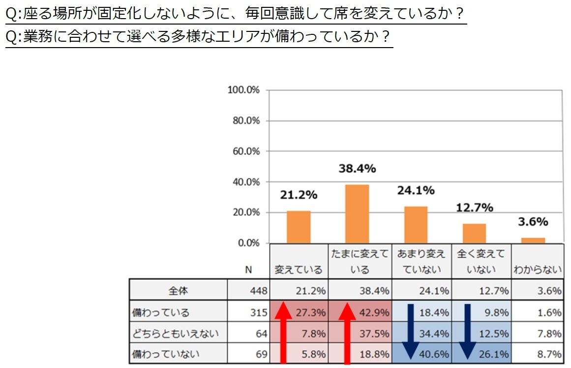 フリーアドレスの利用状況を探るため、仕事をする上で意識的に座る場所を変えているかを調査しました。