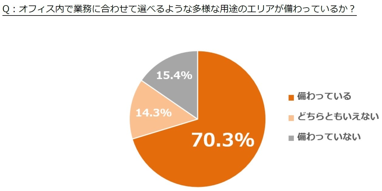 フリーアドレス導入企業の約7割がオフィス内に多様な用途のエリアを備えている。