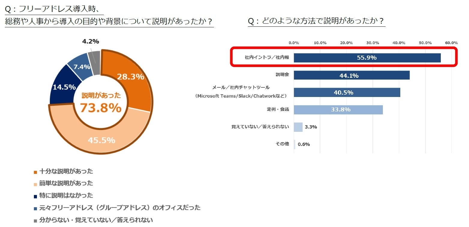 約7割がフリーアドレス導入時に何かしらの説明を受けており、説明方法は「社内イントラ/社内報」がトップ。