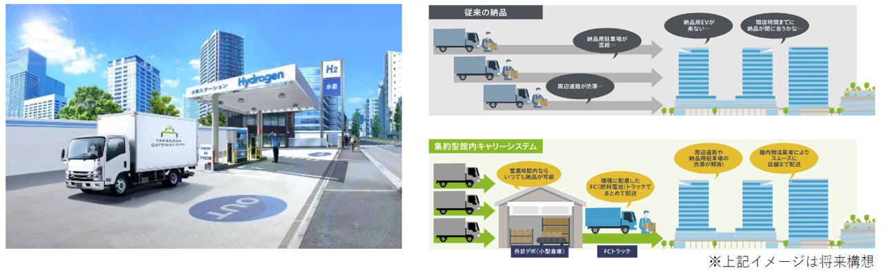環境への配慮とIoTを活用したフレキシブルなロジスティクスを実現する次世代型物流プラットフォームを構築していきます。2025年3月のまちびらきに向けて、まずは2024年6月に外部デポ(小型物流拠点)を平和島(東京都大田区)に整備しました。外部デポを活用した「集約型館内キャリー」では、域外からの荷物を一度外部デポに集約し、そこから効率的に街の中に配送を行います。さらに街の中への配送に、FC(燃料電池)トラック[3]を活用します。これにより、配送の合理化・車両流入台数削減による周辺渋滞緩和やCO₂排出削減など、環境に配慮したまちづくりに貢献していきます。