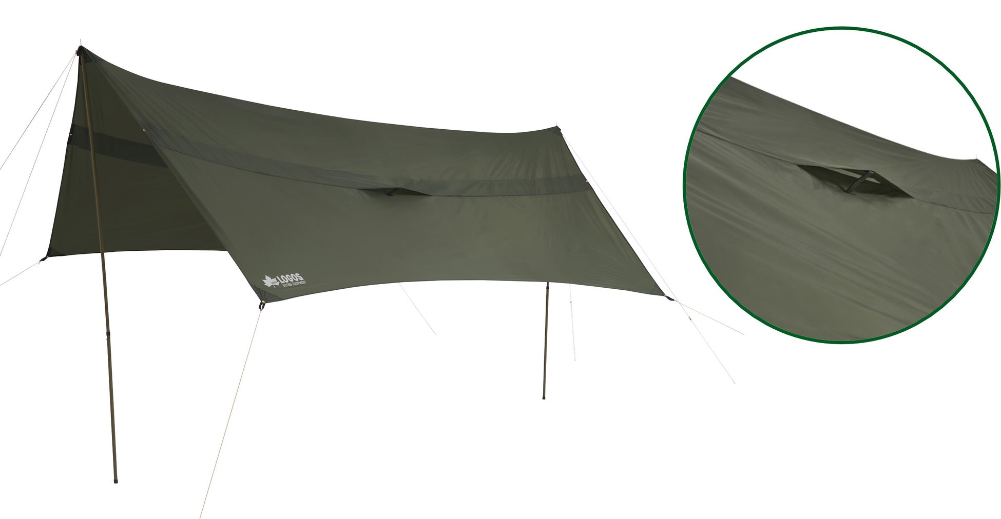 サイズは縦430cm×横440cmで、家族4人でも広々としたリビングスペースを確保でき、耐風性に優れたヘキサ型を採用しました。さらに10ヶ所にグロメットが配置されているため、アレンジの幅がさらに広がり、フレキシブルな張り方を楽しめます。また、設営時にテンションがかかるコーナー部分には補強加工を施しており、長くご使用いただけます。