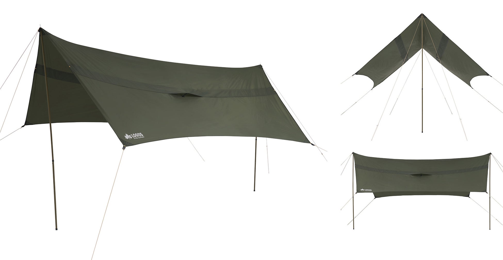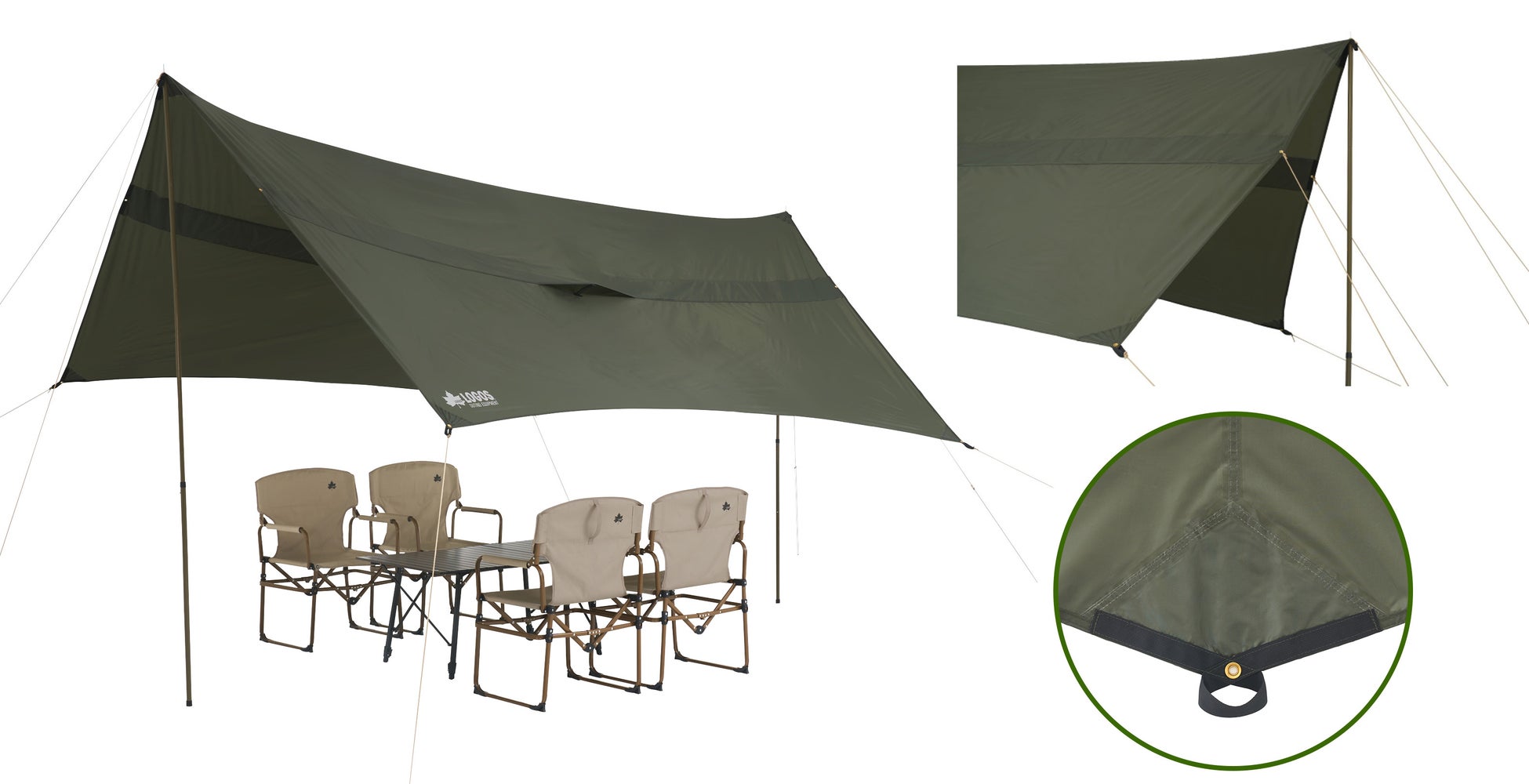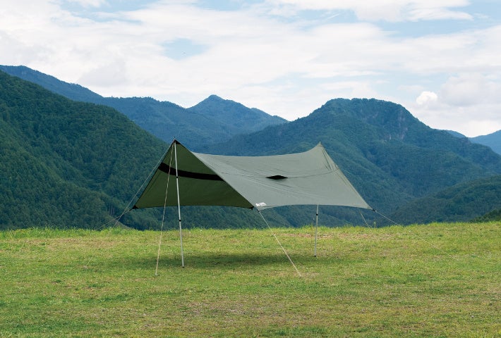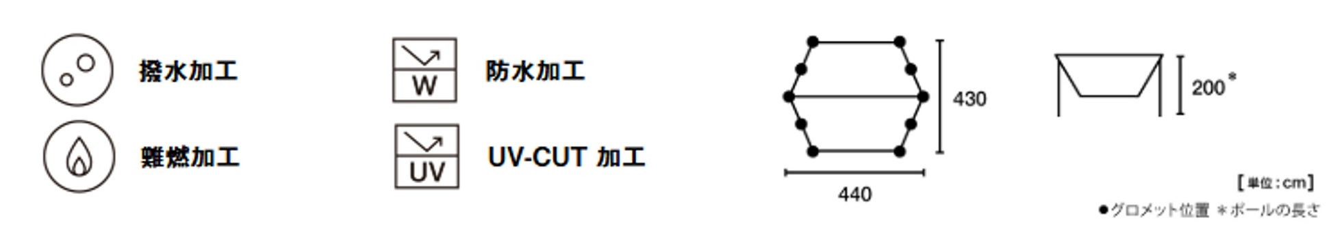 サイズは縦430cm×横440cmで、家族4人でも広々としたリビングスペースを確保でき、耐風性に優れたヘキサ型を採用。10ヶ所にグロメットが配置されているため、アレンジの幅がさらに広がり、フレキシブルな張り方を楽しめる。設営時にテンションがかかるコーナー部分には補強加工を施しており、長く使うことができる。
