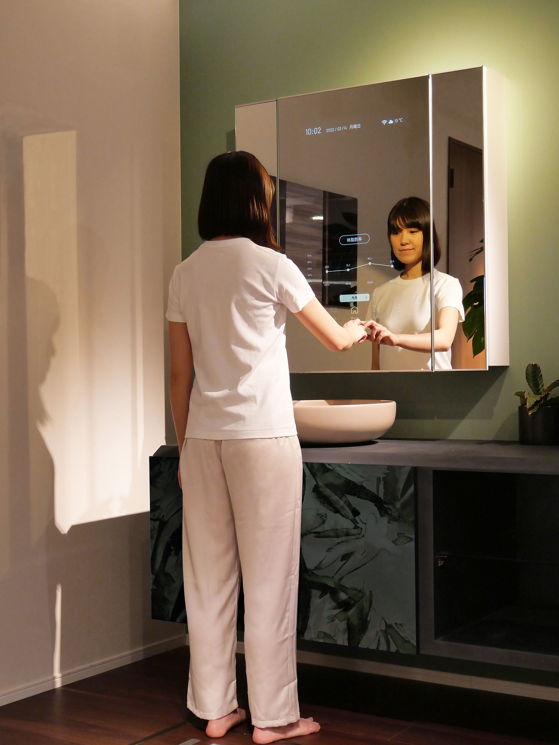 第一弾では、床埋め込み型の体組成計「cheercle™メーター」と、毎日の洗面で使う鏡にセンシングと表示機能を付与した独自開発の「cheercle™ミラー」を組み合わせ、体重、体脂肪率、BMIや肌温度などの情報を自然に収集。ストックされたデータは「cheercle™ミラー」やお使いのスマートフォンで確認できます。
