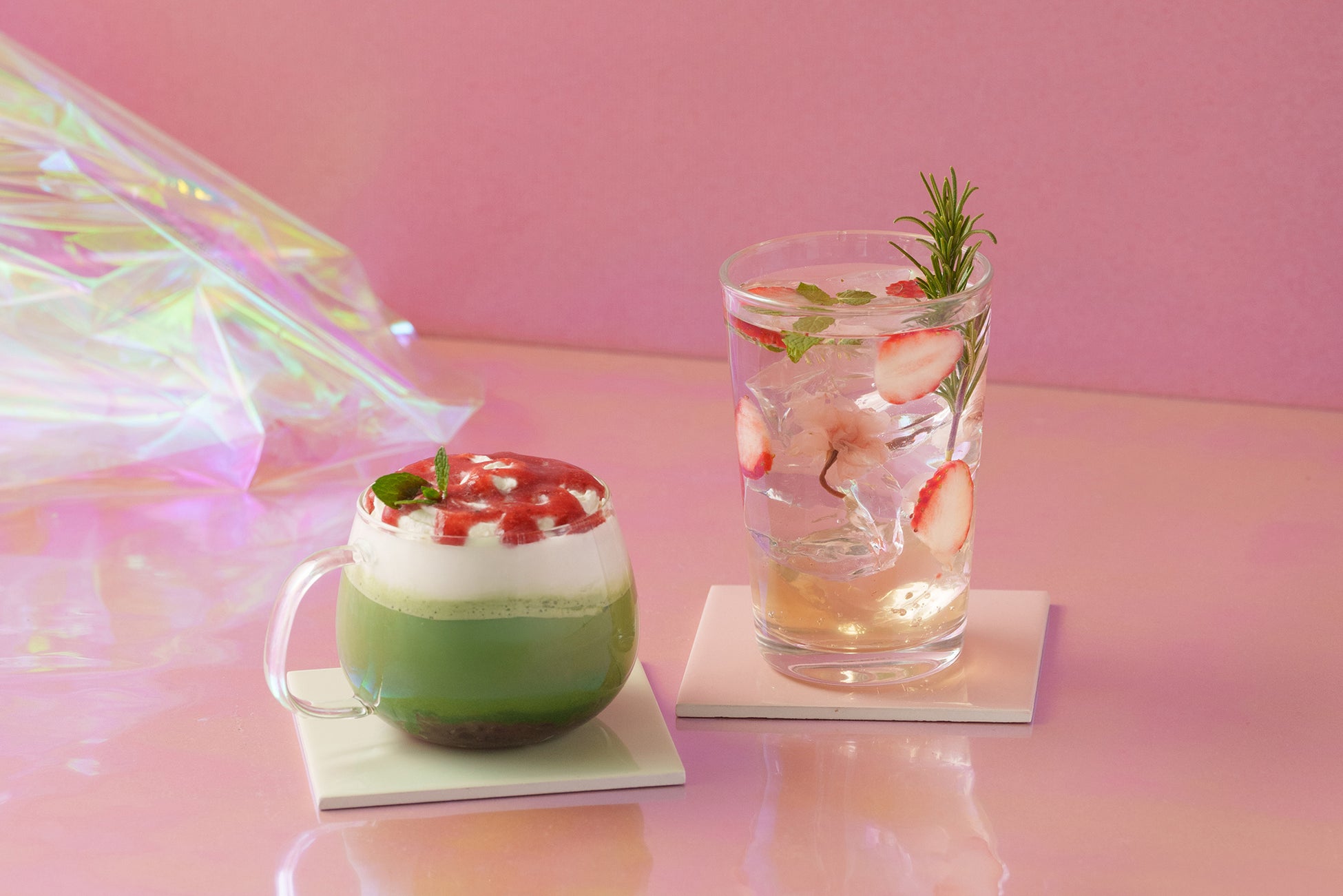 また、同日より桜や旬のいちごなどを使用した2種類のドリンクもご提供いたします。塩漬けした桜とローズマリーの風味が香る「ハーブティー」は、中で咲いた桜の花びらが春らしい、リフレッシュタイムにぴったりな、身体に優しく癒しを与えてくれるドリンクです。京都産宇治抹茶とオーガニックミルクをブレンドし、有機ストロベリーソースをトッピングした「ティーラテ」は、コクと旨味を味わえる贅沢な一品。底に入れた餡を混ぜて“味変”もお楽しみください。