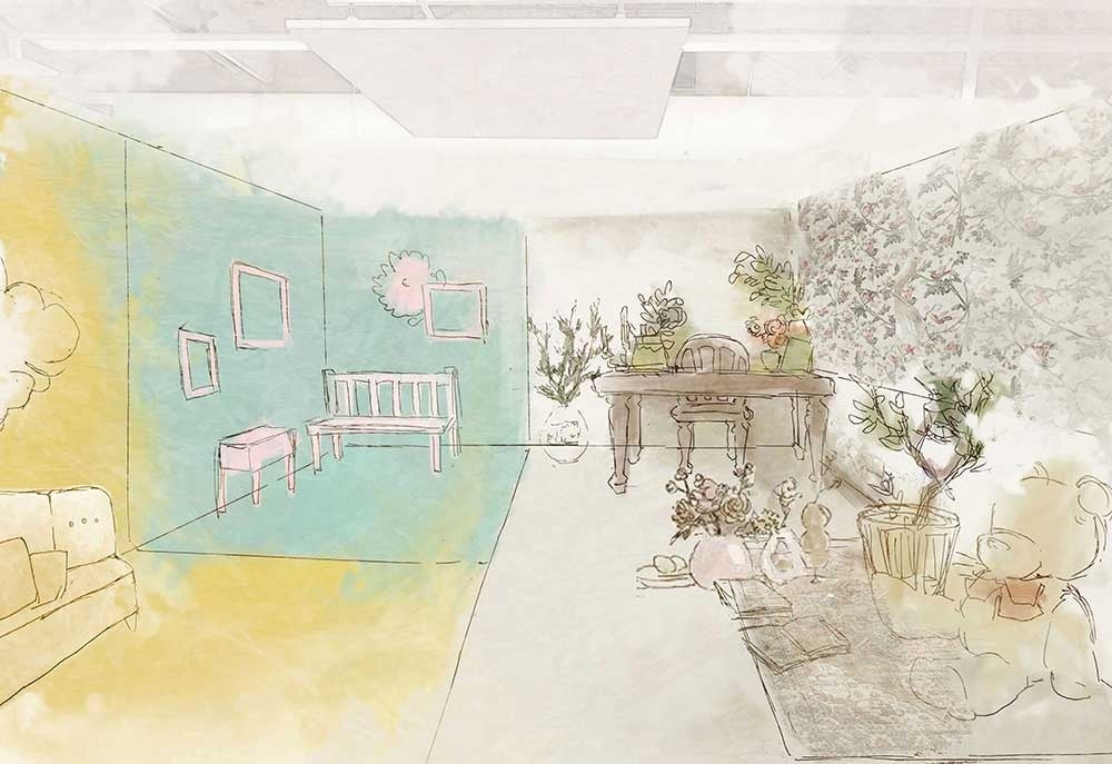 アンティーク調の壁紙や小物の中に、中でも一際雰囲気漂うシンプルでボタニカルな空間。ブラウンの衣装やキャメル色のランドセルでくまのぬいぐるみとのリンクコーデもおすすめ。