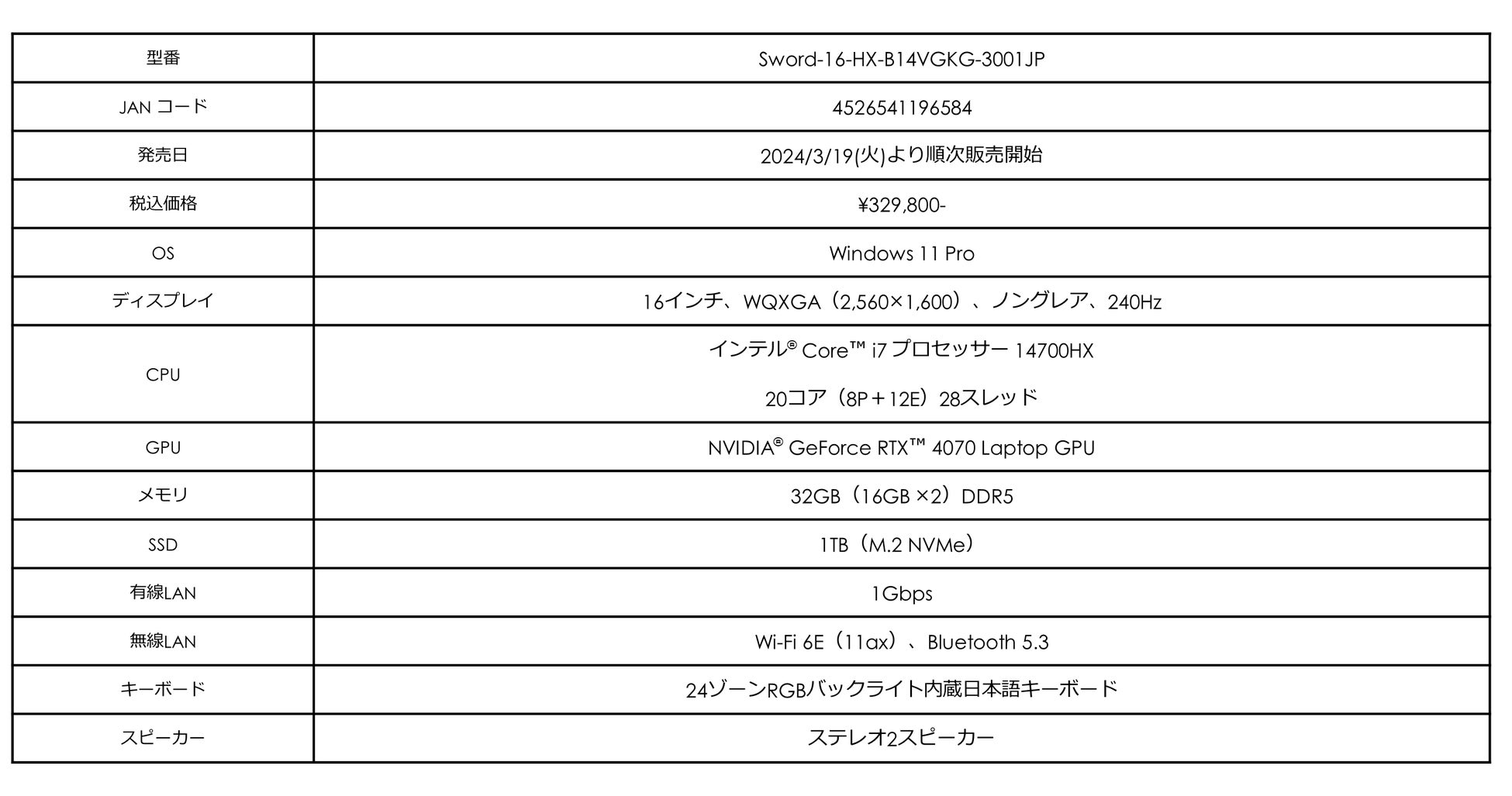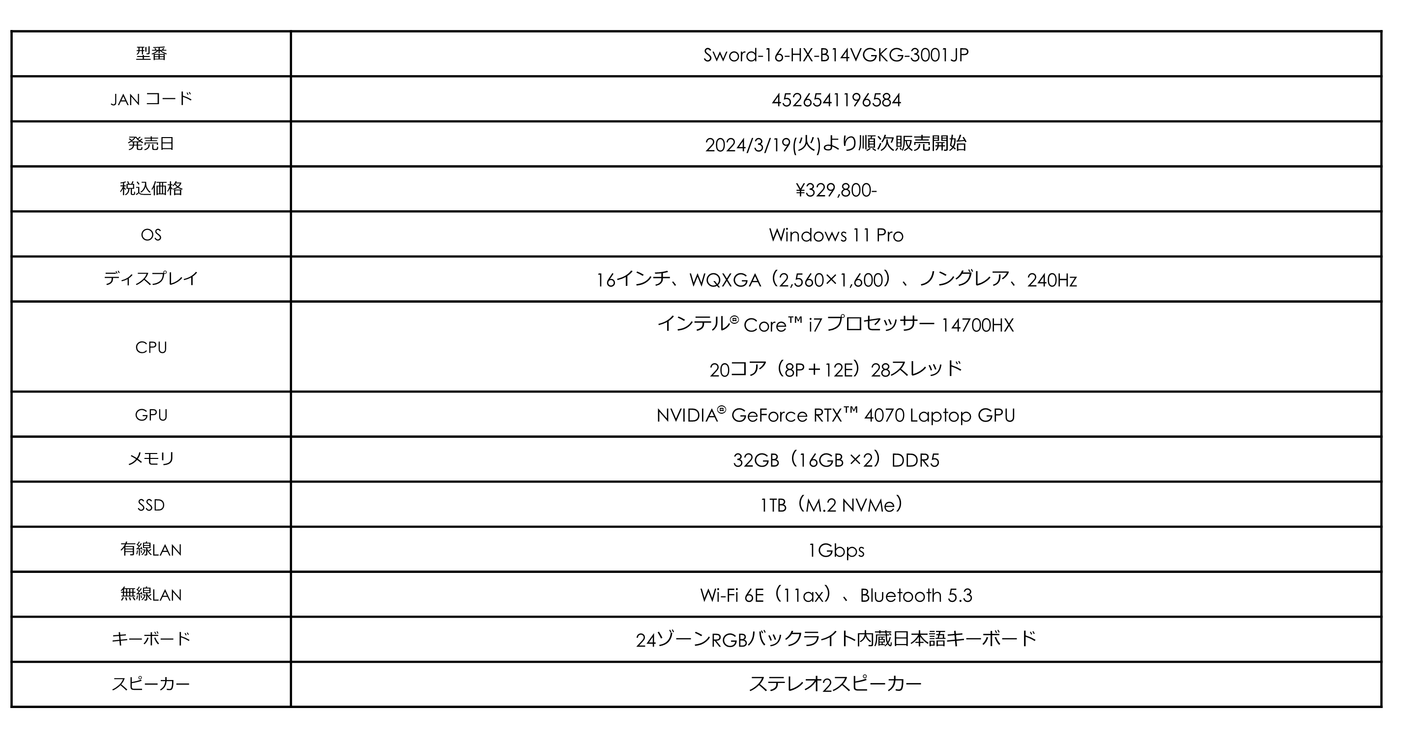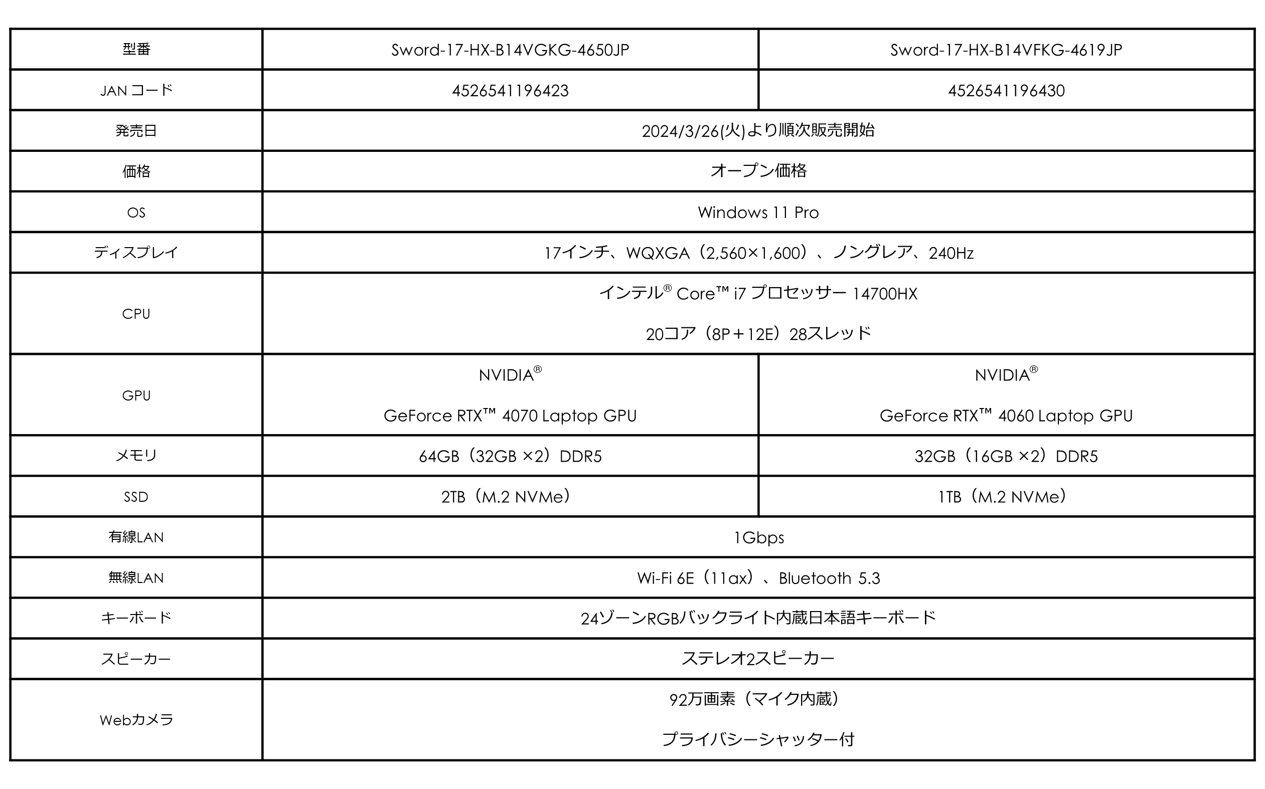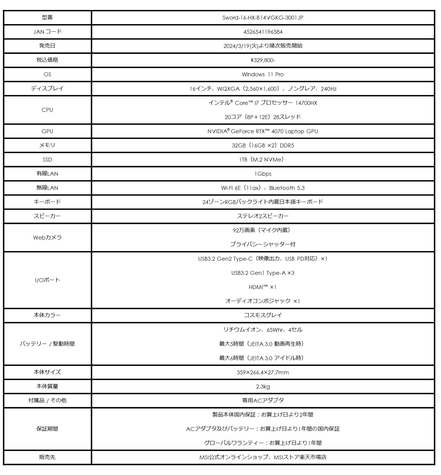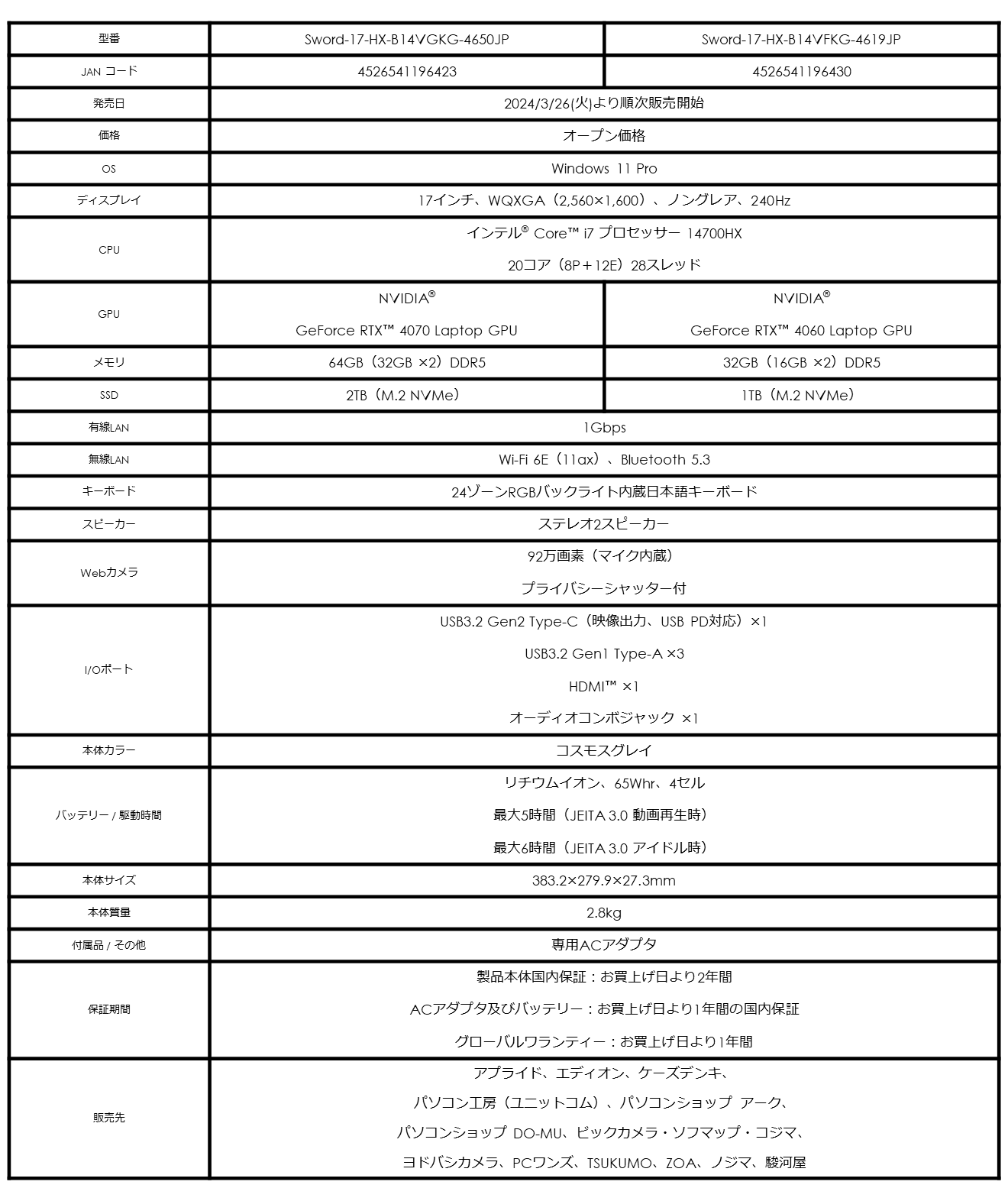 16インチタイプでMSI公式オンラインショップ限定モデル「Sword-16-HX-B14VGKG-3001JP」を2024年3月19日(火)より、17インチタイプで店頭販売モデル「Sword-17-HX-B14VGKG-4650JP」「Sword-17-HX-B14VFKG-4619JP」を2024年3月26日(火)より順次販売開始いたします。