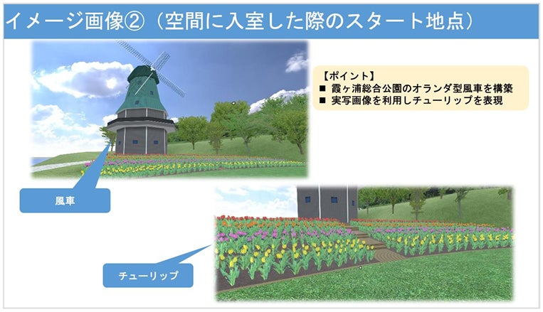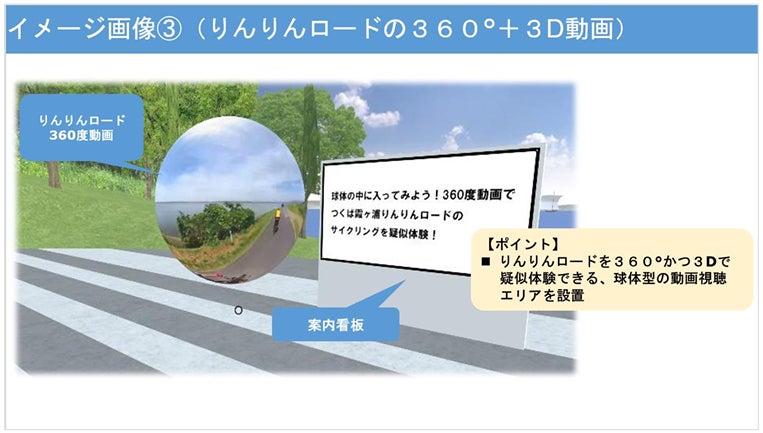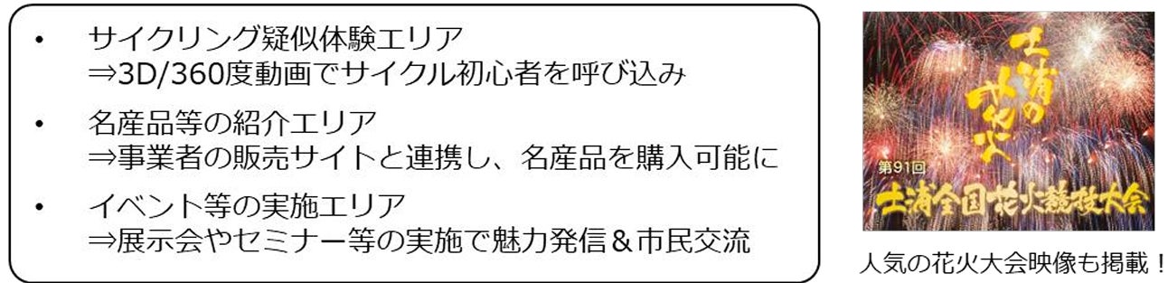 その中で、土浦市とNTT東日本は、メタバース空間構築・360度動画制作・配信に実績のあるNTTスマートコネクトと連携して、「自転車のまち土浦」をはじめとした土浦市の魅力発信、および土浦市来訪のきっかけ作りを目的としたメタバース空間「バーチャルつちうら」の構築に取り組み、この度、土浦市はメタバース空間「バーチャルつちうら」において、りんりんロードのサイクリング疑似体験(3D/360度動画)、市政情報や名産品の掲載・販売、展示会やセミナーの開催などのコンテンツ提供を開始いたします。