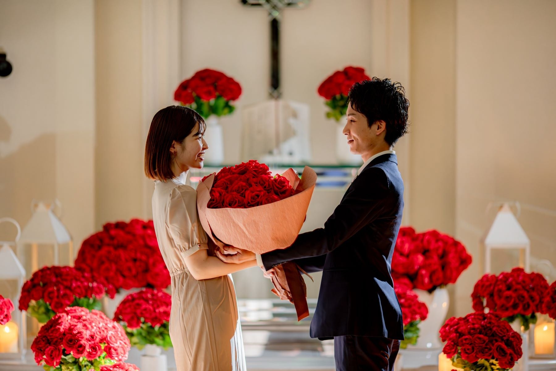 チャペルを貸切にし 「ドラマや映画で見たシーンのように、とびきりドラマティックにしたい」という想いを叶えるプランは、料理長特製のディナーコースをお召し上がりいただいた後、「1万年の愛を誓います」の意味を持つ1,000本の赤薔薇アートフラワーとキャンドルで彩られたチャペルで、薔薇の花束を添えてサプライズプロポーズ。また、プロポーズ後は、メッセージプレート付きで、パーソナルな演出が可能なホールケーキをご用意。大切な瞬間を残していただける動画撮影や、チャペル内での生演奏などオプションメニューも充実。一生の想い出に残るサプライズプロポーズを全面的にサポートいたします。