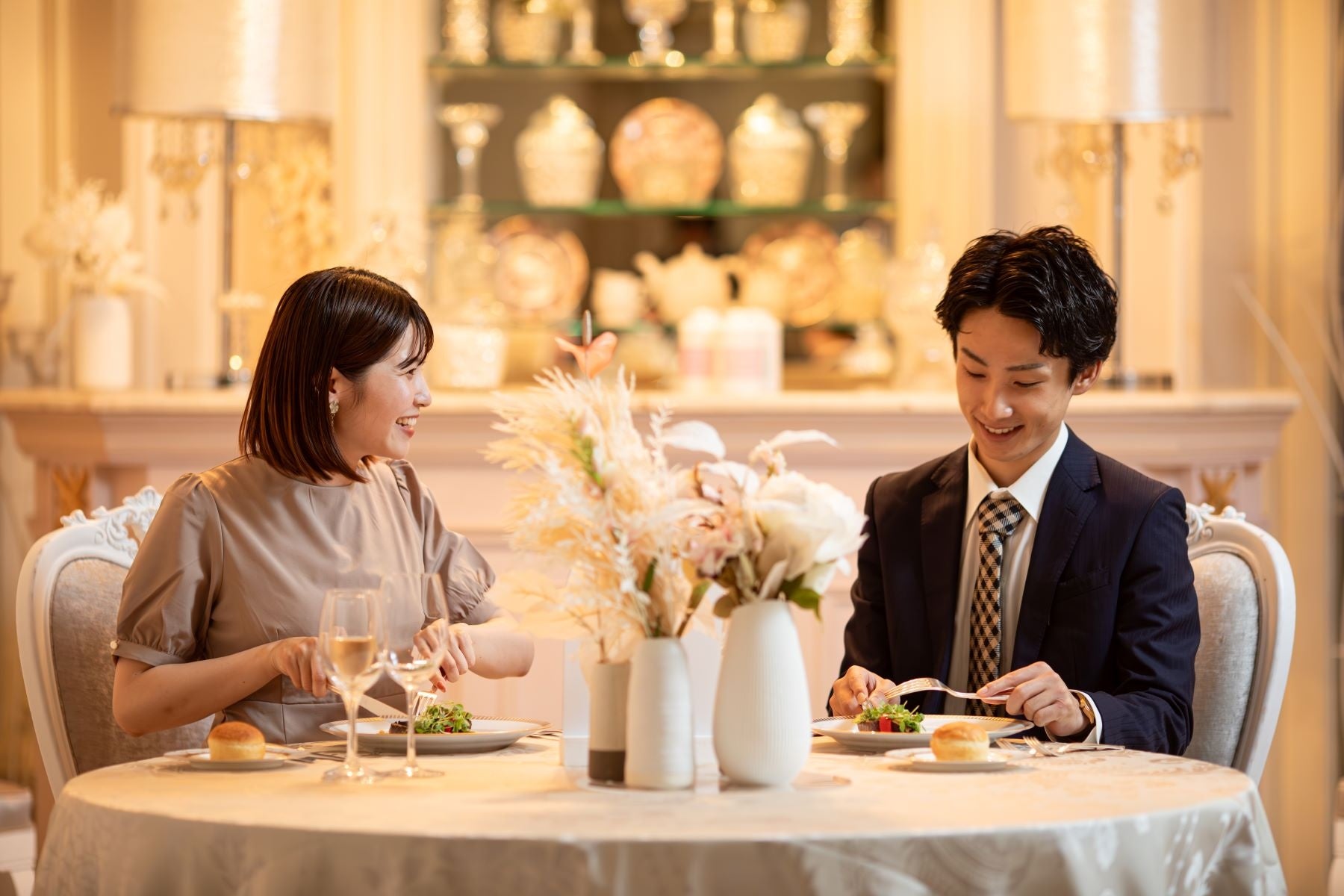 普段は披露宴会場として使用されている、煌びやかな空間でプロポーズディナーをご堪能いただいた後、キャンドルが揺らめく白亜の独立型チャペルでプロポーズを行っていただけるプラン。