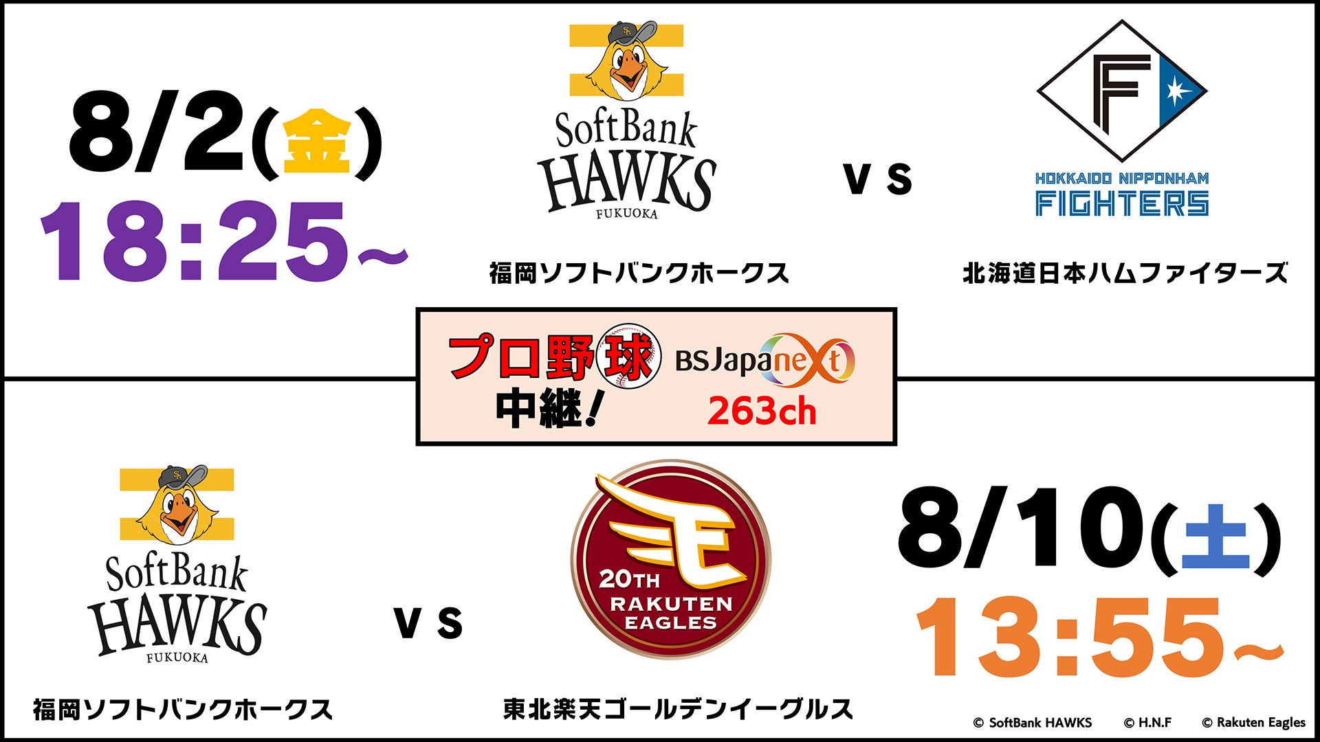 無料のBS放送局 『BSJapanext』(読み:ビーエスジャパネクスト)は、8月2日(金)にプロ野球「福岡ソフトバンクホークスvs北海道日本ハムファイターズ」を、8月10日(土)に「福岡ソフトバンクホークスvs東北楽天ゴールデンイーグルス」を生中継いたします。4年ぶりの日本一を目指す福岡ソフトバンクホークスに、追う北海道日本ハムファイターズ、東北楽天ゴールデンイーグルス。始まったばかりの後半戦を占う注目の2試合です。