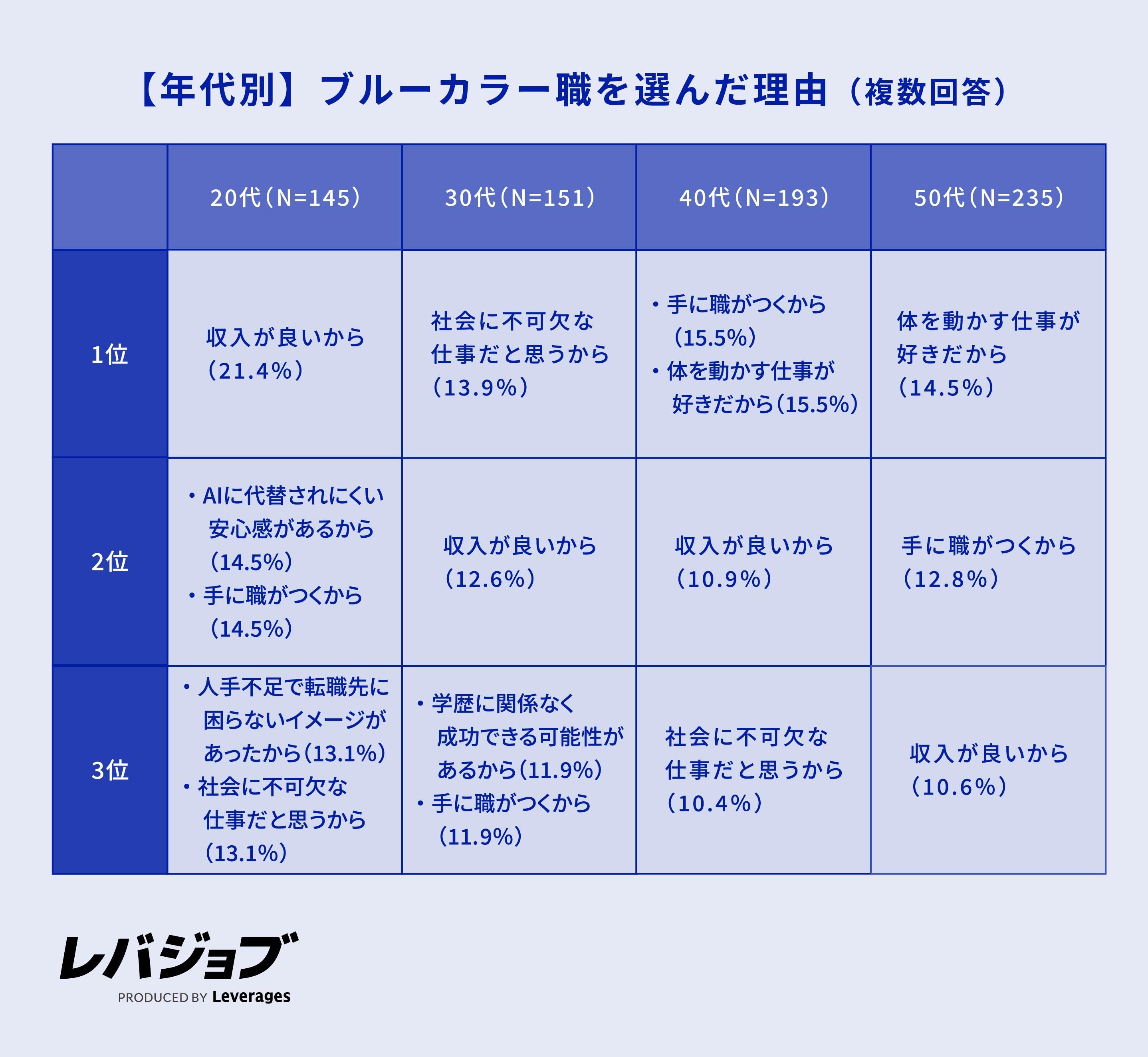 レバレジーズ株式会社が運営するエッセンシャルワーカー向けキャリア支援サービス「レバジョブ」(https://levjob.jp/)は、現在ブルーカラー職に従事している724名を対象に*1、キャリアに関する実態調査を実施しました。