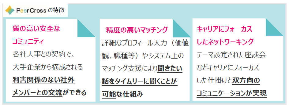 「PeerCross」は、JR東日本が運営しているキャリア形成支援サービスです。企業に所属するワーキングマザーが、会いたい人をタイムリーに探してマッチングし、1on1で相談することが可能です。また、話したいテーマを設定して座談会の企画をすることもできます。