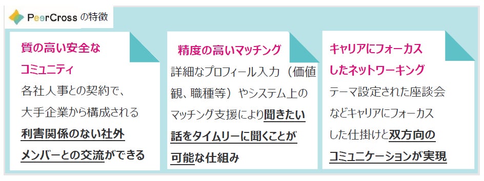 「PeerCross」は、女性活躍を推進する企業向けのサービスです。より多くの皆様へのサービス提供を通じ、両社で企業におけるワーキングマザーのロールモデル不足や女性管理職比率向上といった課題解決の支援に取り組んでまいります。