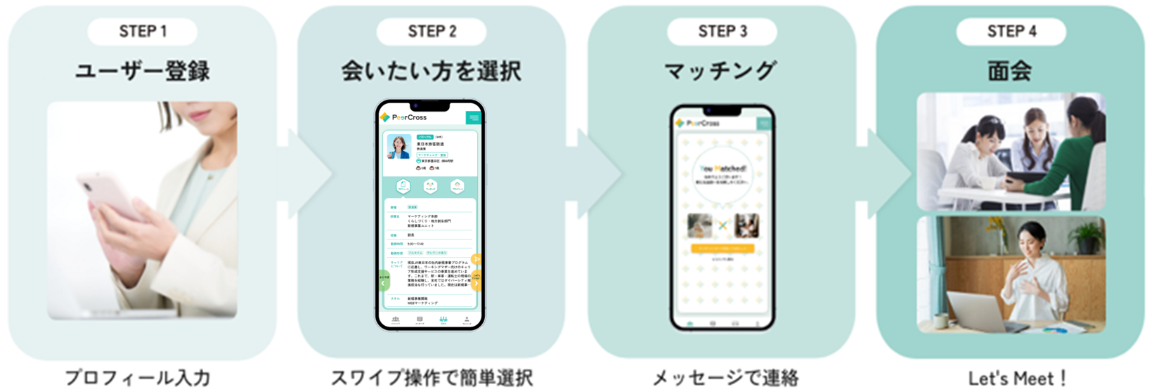 マッチングでは、「PeerCross」が定期的にレコメンドする候補者の中から自分と近しい価値観や境遇の方と簡単にマッチングができ、会社や業界を超えたネットワーキングが可能です。これを通じ、個人の状況に応じた中長期的なキャリアを前向きに考えられるよう、参加者に意識変容、行動変容を促します。本事業はJR東日本グループにおける公募制の新事業創造プログラム「ON1000(オンセン)」で社員が提案し採択されたものです。