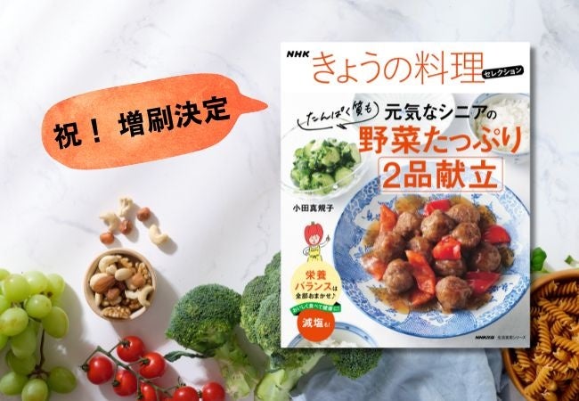 NHK出版より3月18日に発売になった『NHKきょうの料理セレクション 元気なシニアの野菜たっぷり たんぱく質も 2品献立』が、売れ行き好調につき、増刷が決定しました。増刷決定を記念して、皆さんから注目度の高い減塩レシピを特別公開します。あわせて講師の小田真規子さん、編集部から喜びのコメントが届きました。