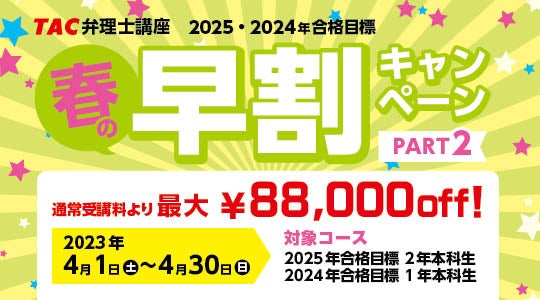 公認会計士や税理士など、 多くの国家資格や検定試験の受験指導などの教育事業を展開しているTAC株式会社(東京都千代田区、 代表取締役:多田敏男)は、 弁理士講座から、 受講料が最大88,000円割引になる春の早割キャンペーンを4月30日(日)まで実施することを報告いたします。