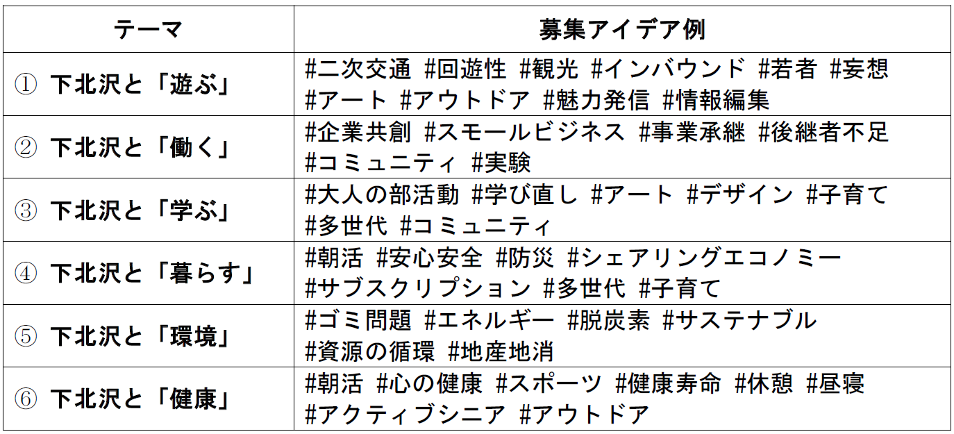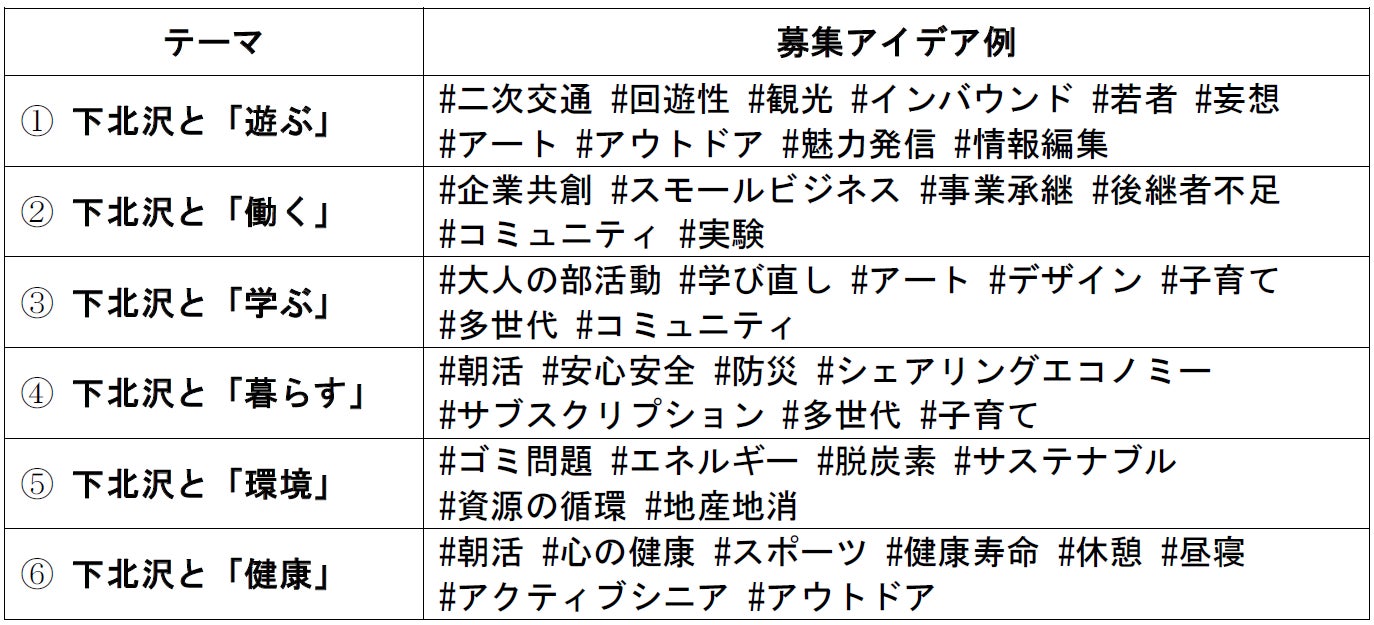 第一弾は多様な文化が交わり、絶えず自由に変わり続ける下北沢を舞台に、「遊ぶ」「働く」「学ぶ」「暮らす」「環境」「健康」の6つのテーマを設定しアイデアを募集します。