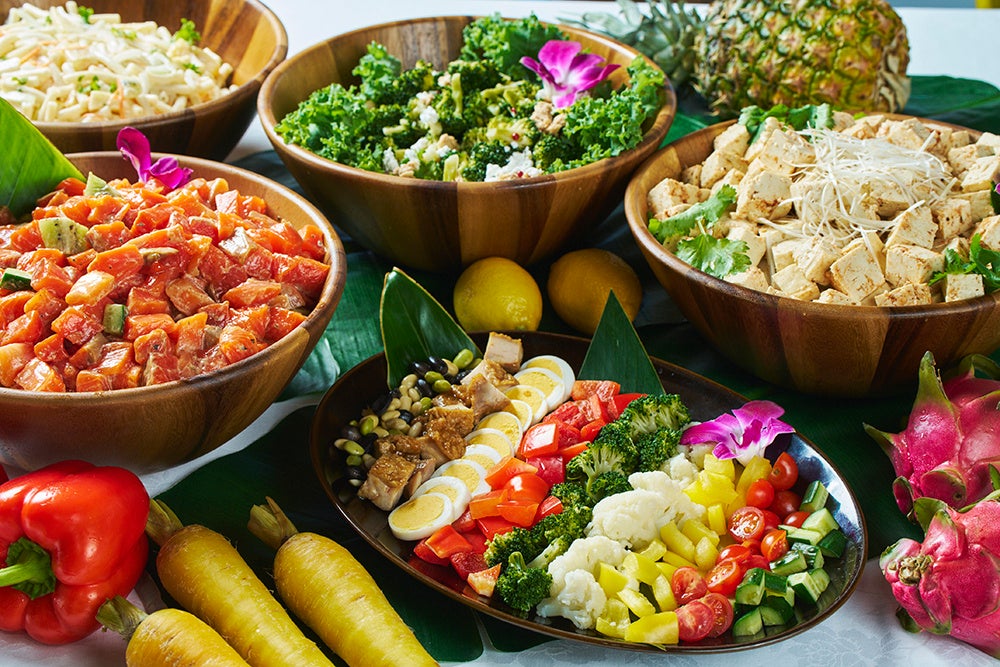 <Salad> 島豆腐のポケ、サーモンとフルーツのロミロミサラダ、パパイヤサラダなど10種類の サラダを自家製ドレッシングでお召し上がりください。