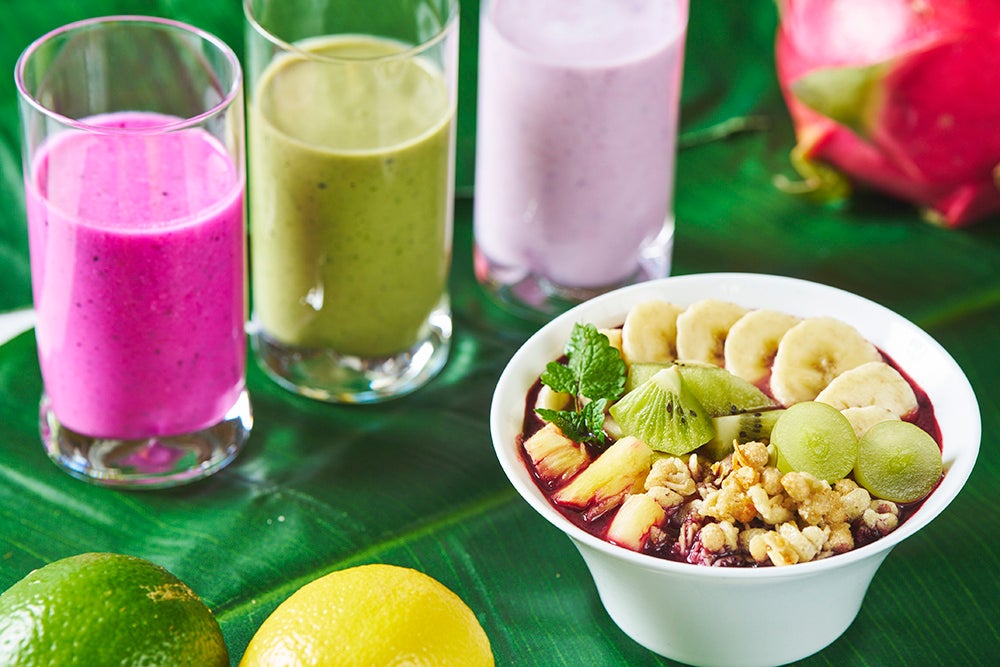 <Smoothie> ドラゴンフルーツ&ヨーグルト、キウイ&ケール、ミックスベリー&バナナなど 3 種のスムージーをお楽しみください。