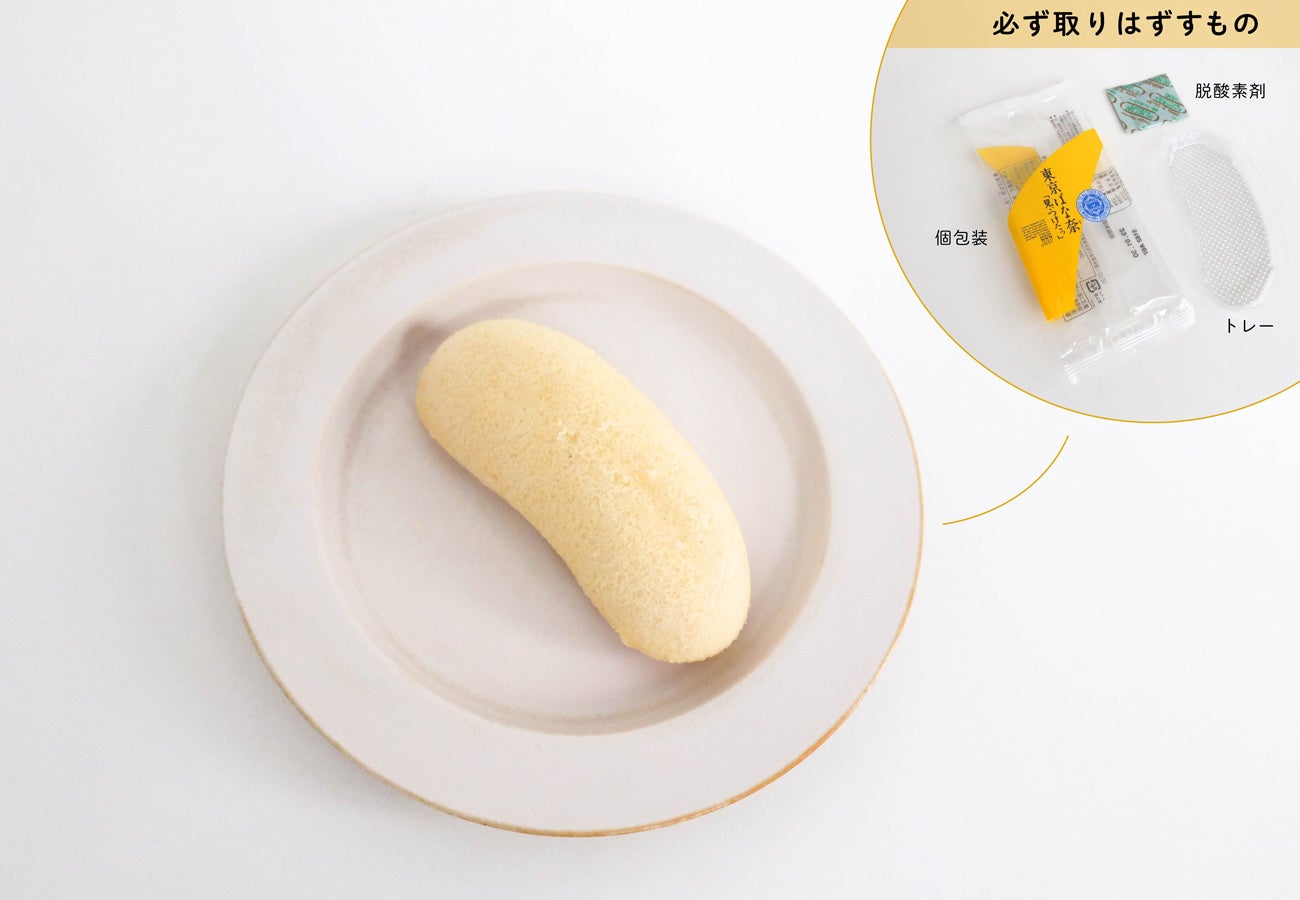 ①東京ばな奈を個包装から取り出し、お皿に乗せてください。
