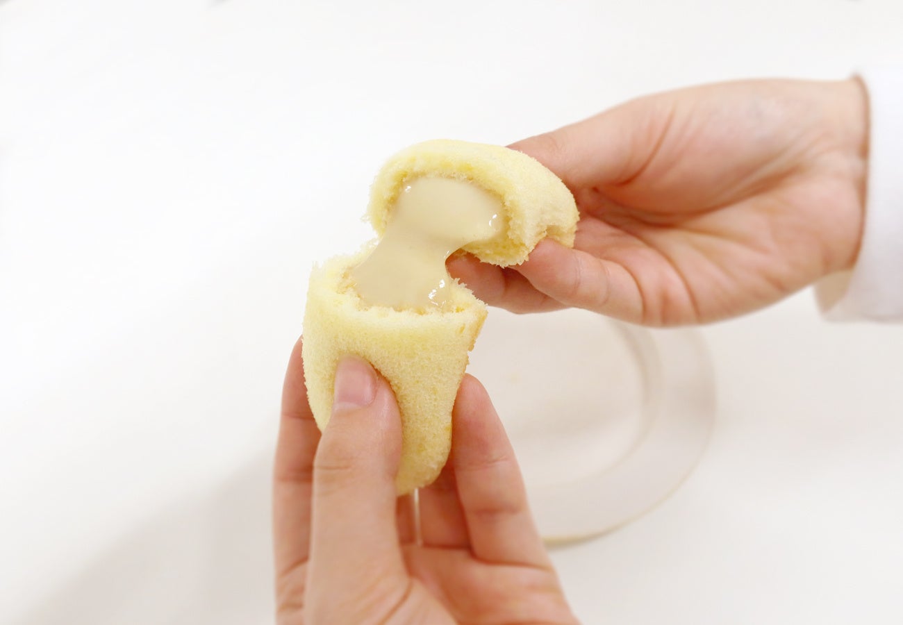 ③クリームとろりん!ほかほか“温東京ばな奈”の出来上がりです。温かいうちにお召し上がりください! ※やけどにはご注意ください。