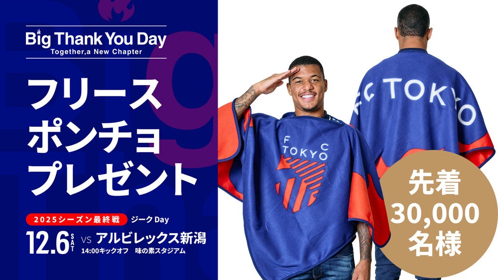 『Big Thank You Day』開催を記念して、シーズンの最後を締めくくる重要な一戦を暖かく快適に応援いただけるように、オリジナルデザインの『フリースポンチョ』を先着30,000名様にプレゼントします。