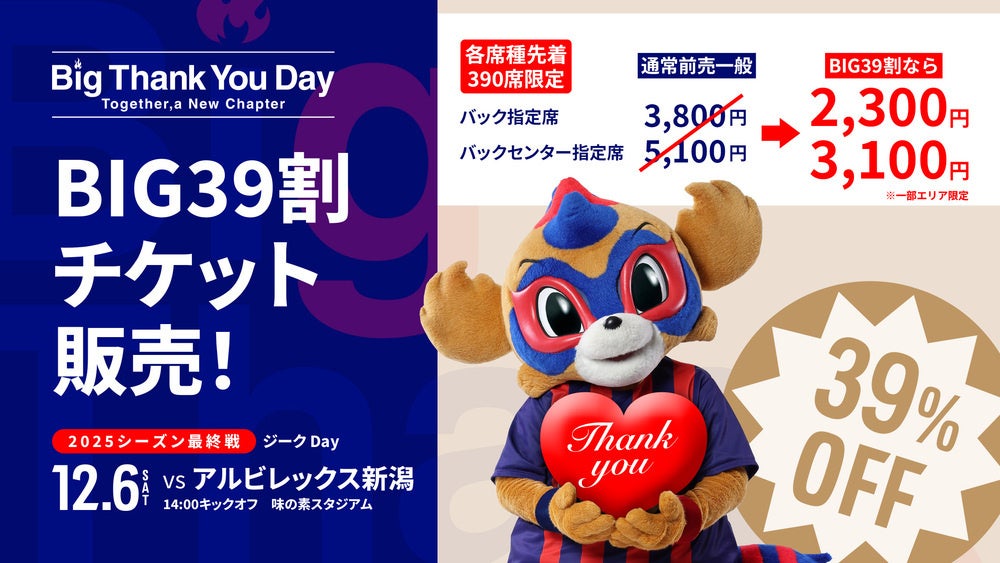 『Big Thank You Day』にちなみ、この試合限定で『BIG39割チケット』を販売します。今シーズンのサポートへの感謝を込めて、『39(Thank you)』に関連するエリアの一部を数量限定・先着順で約39%オフにてお得にご購入いただけるチケットです! ぜひお早めにお買い求めください!