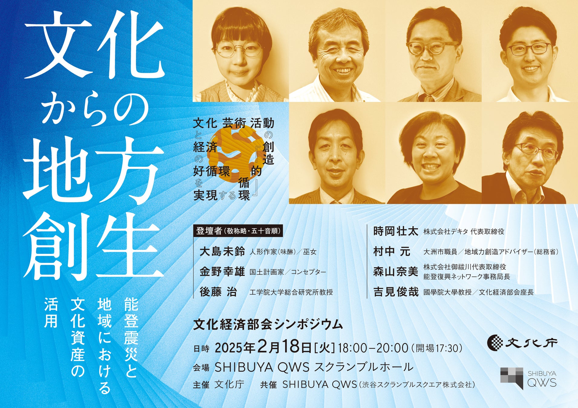 文化庁は、令和3年より文化審議会に文化経済部会を設置し、我が国の文化と経済の好循環の実現に向けた調査審議を行ってきました。この度、文化経済部会座長の吉見俊哉氏(國學院大學教授)、森山奈美氏(株式会社御祓川代表取締役/能登復興ネットワーク事務局長)をはじめ、全国から多様なバックグラウンドを持つ登壇者をお招きし、「文化とビジネスの協働」をキーワードに、我が国文化芸術の持続的な発展・継承を可能とする方策をについて考えるシンポジウムの第2弾「文化からの地方創生 ―能登震災と地域における文化資産の活用―」(日時:令和7年2月18日[火]18:00〜20:00、場所:SHIBUYA QWS スクランブルホール)を開催します。