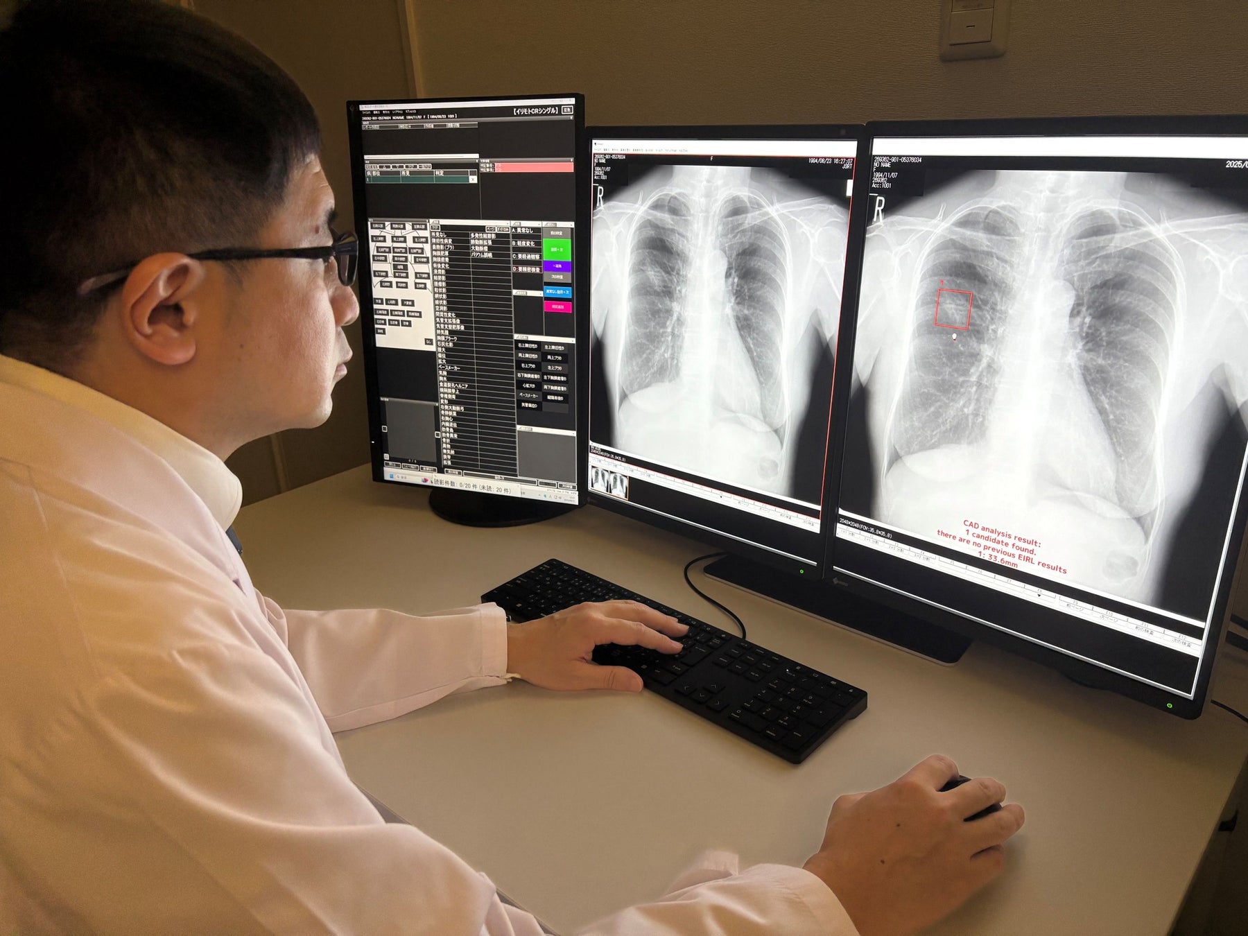 特にX線画像から病気の有無や程度を診断する“検診読影”に関しては、これを行う医師の確保が難しくなりつつあります。日本では肺がん検診に胸部X線画像の読影が行われており、厚生労働省の定める”がん検診実施のための指針”では「2名以上の医師による二重読影」が推奨されています。そうした状況に対し、医師1名による読影とAI技術の併用が可能となれば、医師の負担軽減と限られた人材の持続的な活用につながると期待されています。