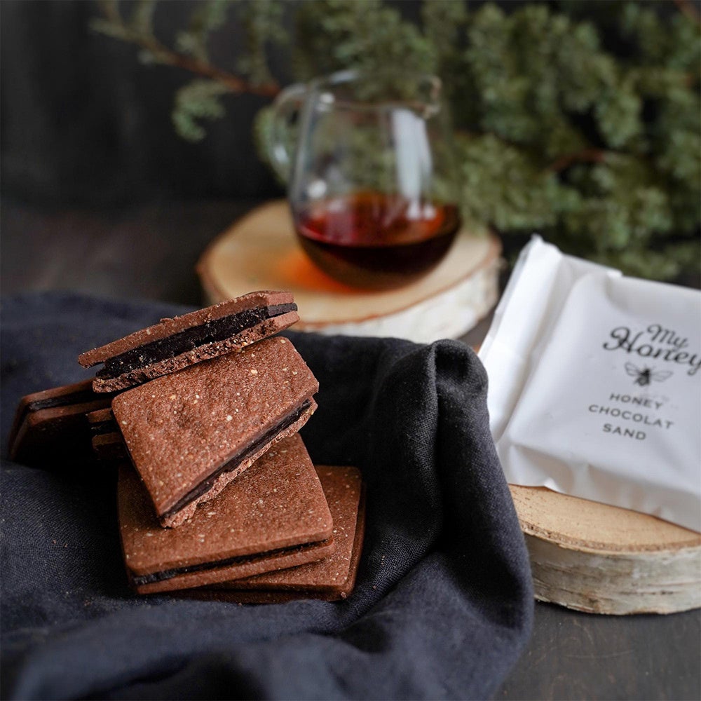 デイリーフリー(乳製品不使用)、たまごフリー、グルテンフリー(小麦粉不使用)で甘さは「アカシアはちみつ」だけ。1枚ずつ手作りで仕上げた罪悪感のないショコラサンドです。