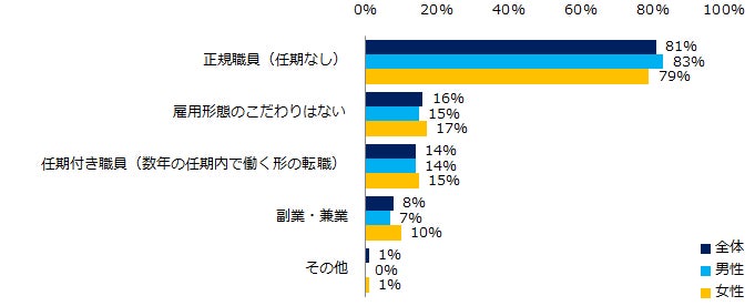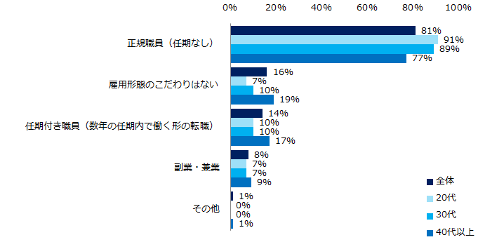 3:官公庁・自治体への転職で希望する雇用形態、1位は「正規職員」。40代以上は他の年代に比べ「雇用形態のこだわりはない」のポイントが高い結果に。(図8~9)