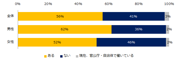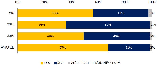 「官公庁・自治体への転職に興味はありますか?」と伺ったところ、56%が「ある」と回答しました。男女別では、女性(52%)よりも男性(62%)が10ポイント関心が高いことがわかりました。年代別で見ると、20代:36%、30代:49%、40代以上:67%と、年代が上がるほど興味のある人が増加する傾向です。