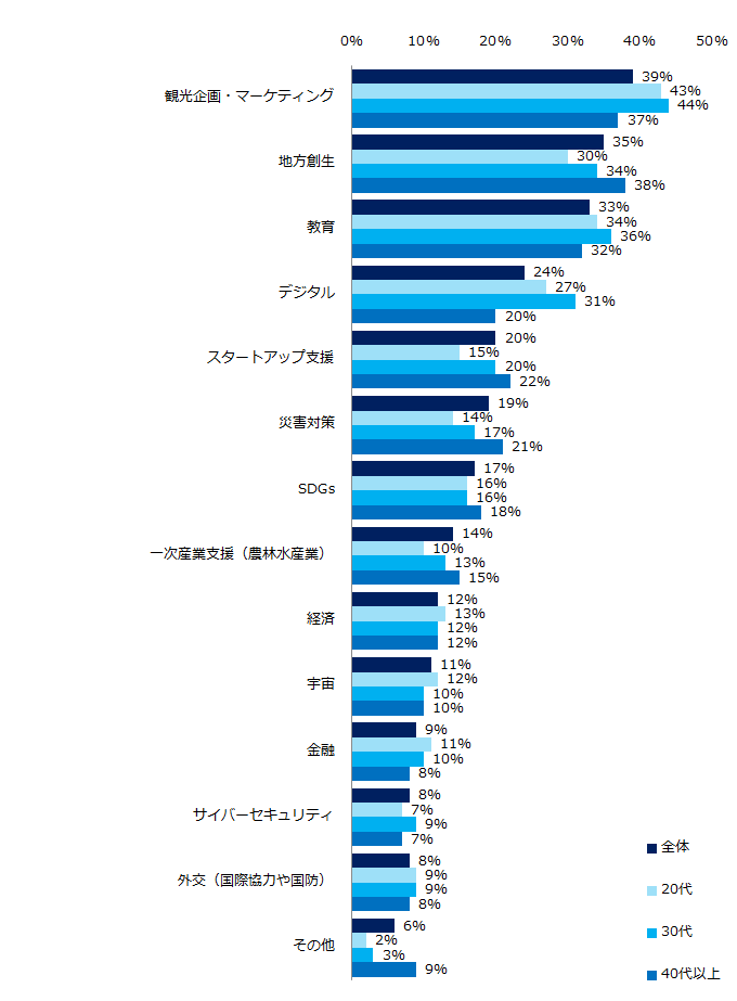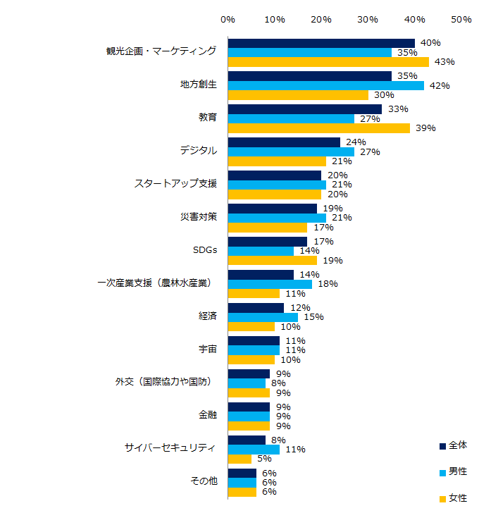 男女別で見ると、男性の興味がある分野トップ3は、1位「地方創生」(42%)、2位「観光企画・マーケティング」(35%)、同率3位「教育」「デジタル」(27%)。女性の興味がある分野トップ3は、1位「観光企画・マーケティング」(43%)、2位「教育」(39%)、3位「地方創生」(30%)でした。