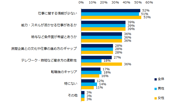 4:官公庁・自治体へ転職するにあたって不明・不安な点、第1位は「仕事に関する情報が少ない」。女性は男性に比べ、18ポイント「働き方の柔軟性」に関心・不安が高い傾向。(図10~11)
