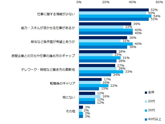 「官公庁・自治体への転職を考えた際に、不明な点・不安な点を教えてください」と伺ったところ、第1位は「仕事に関する情報が少ない」(52%)でした。次いで、「能力・スキルが活かせる仕事があるか」(39%) 、「給与など条件面が希望とあうか」(36%)が続きます。