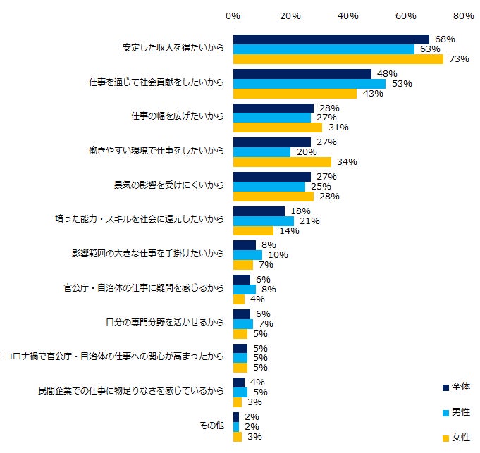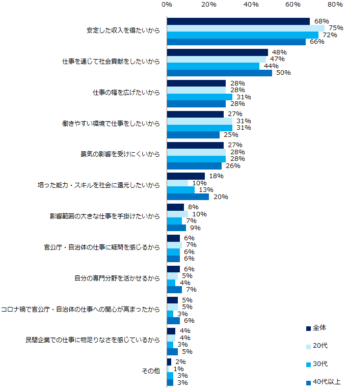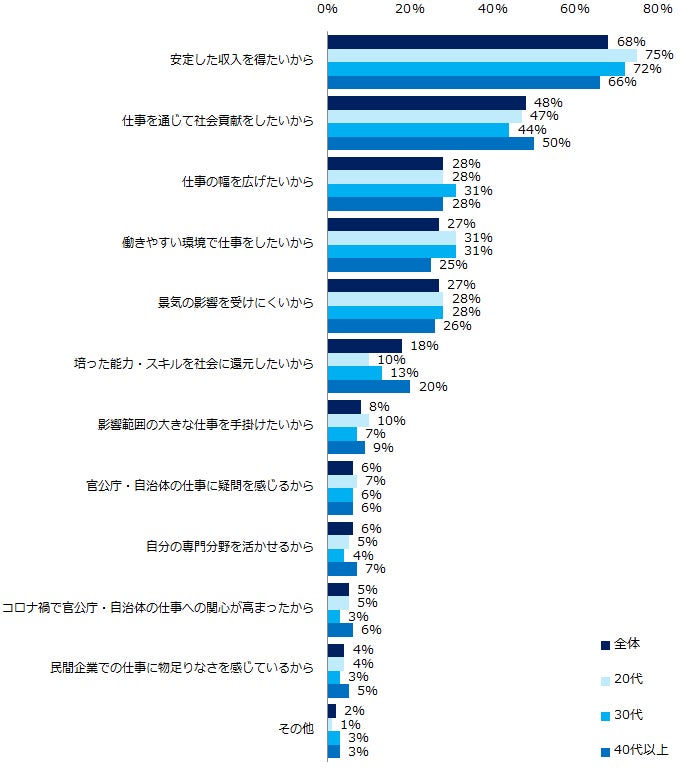 また、「官公庁・自治体への転職に興味がある」と回答した方に理由を伺うと、上位は「安定した収入を得たいから」(68%)、「仕事を通じて社会貢献をしたいから」(48%)でした。男女別で10ポイント以上差が開いたのは、 「安定した収入を得たいから」(男性:63%、女性:73%) 、「仕事を通じて社会貢献をしたいから」(男性:53%、女性:43%)、「働きやすい環境で仕事をしたいから」(男性:20%、女性:34%)。年代別では「培った能力・スキルを社会に還元したいから」が20代(10%)と40代以上(20%)で10ポイントの差が開く結果となりました。