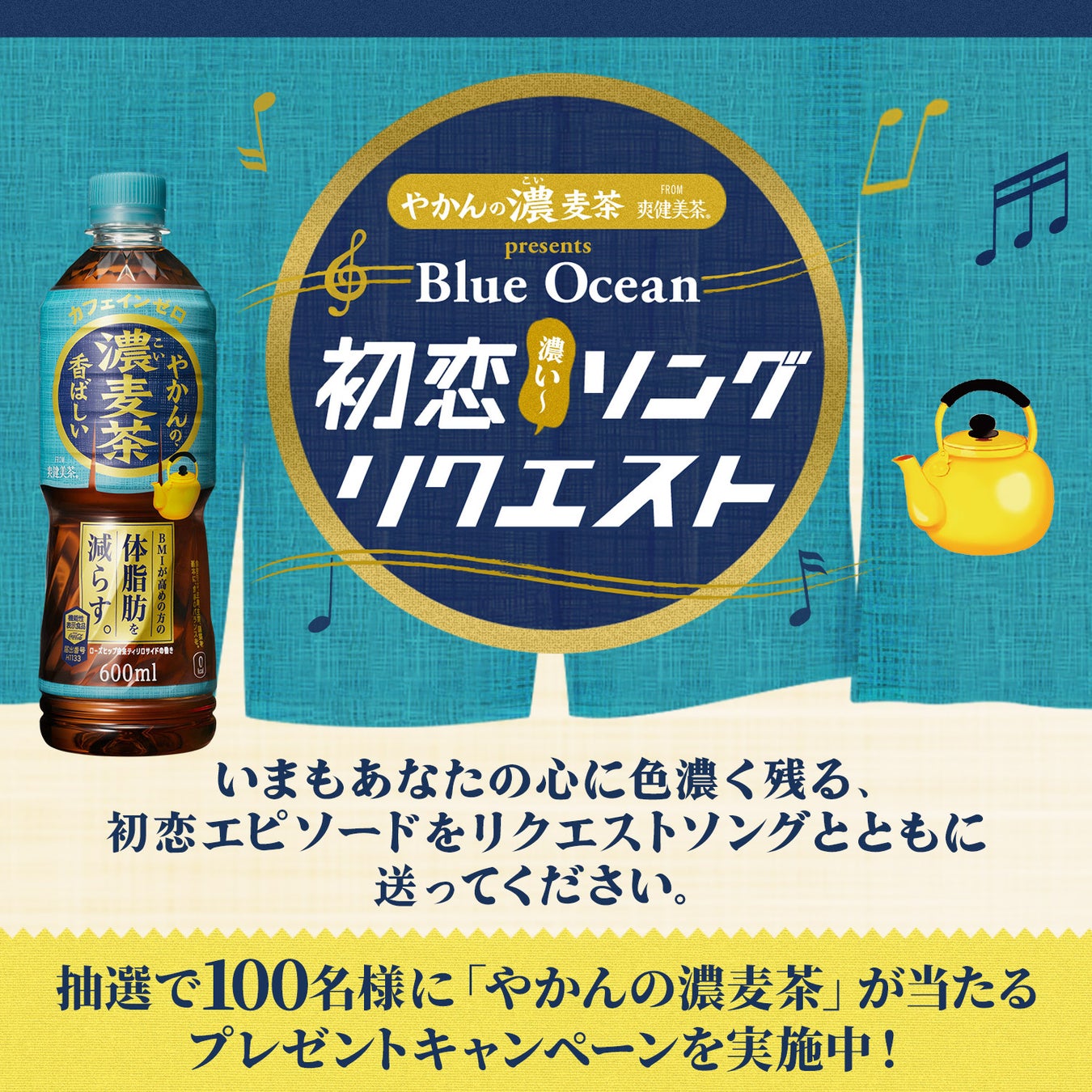 TOKYO FMの生ラジオ番組『Blue Ocean』にて、「Blue Ocean 初恋ぃソングリクエスト」を4月22日(月)から5月30日(木)までの期間限定で「やかんの濃麦茶」による提供で実施します。「やかんの濃麦茶」がお届けする“初めての濃い体験”にかけて、リスナーの皆様から今でも心に色濃く残る初恋エピソードを、当時聴いていた想い出の曲とともに「初恋ぃソングリクエスト」として募集。エピソードが読み上げられた方には、「やかんの濃麦茶」をプレゼント!さらに、全国 38 局のネット局で、地元のパーソナリティによる「初めてのやかんの濃麦茶体験」を CM として放送。全国の人気パーソナリティとともに、心踊る“初めての濃い体験”に満足するひと時をお届けします。