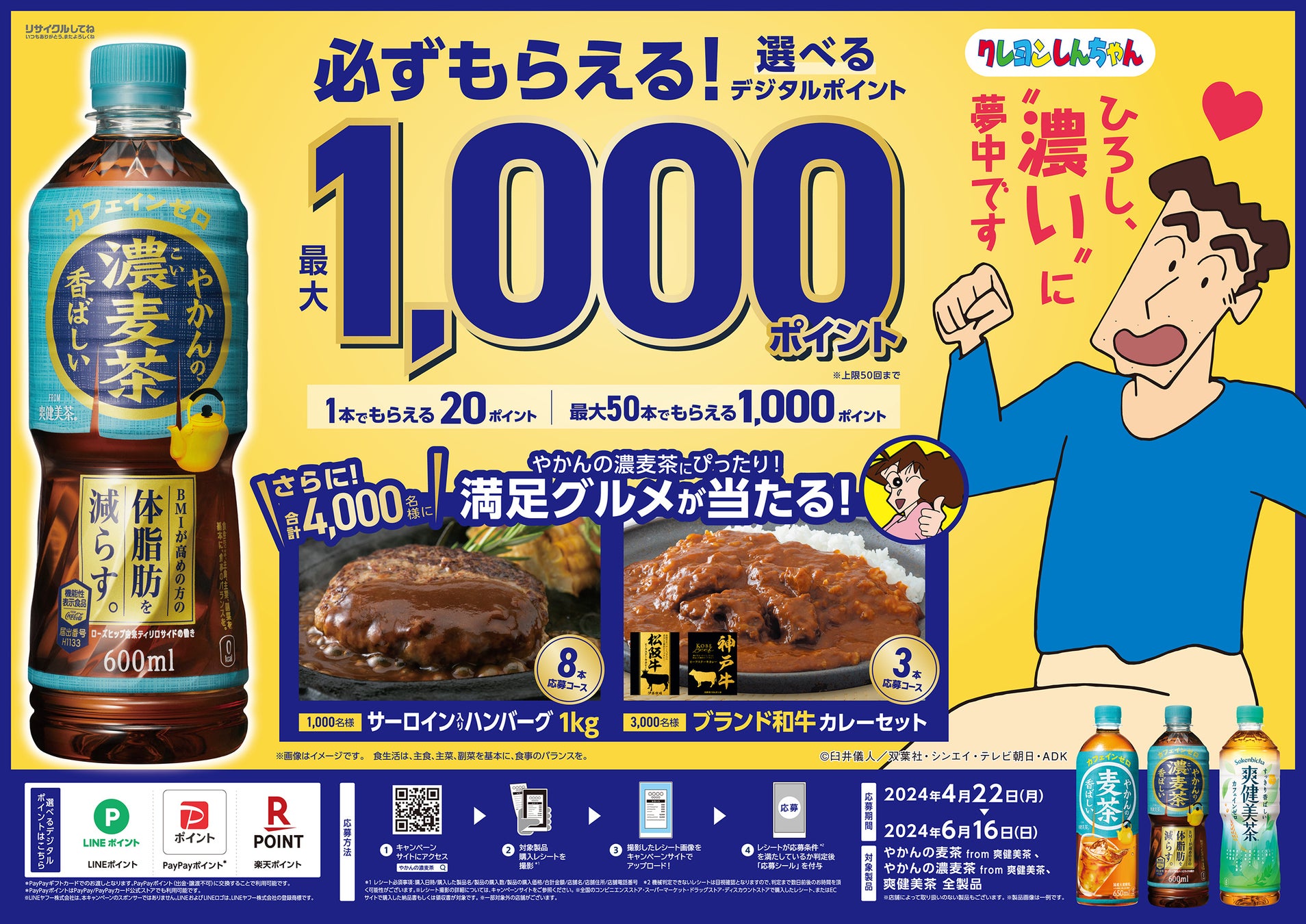 『クレヨンしんちゃん』の人気キャラクター野原ひろしと初コラボ! 「やかんの濃麦茶」などの対象製品を購入し、キャンペーンサイトにアクセスし、購入したレシートを撮影しアップロードすると、マイページにポイントとして反映され、キャンペーンに応募ができます。応募すると、選べるデジタルポイント(LINEポイント、PayPayポイント*、楽天ポイント)がお一人様最大1,000ポイントもらえます。さらに、対象製品を3本、または8本購入すると、「やかんの濃麦茶」にぴったりの満足グルメが合計4,000名様に当たる抽選に応募できます。