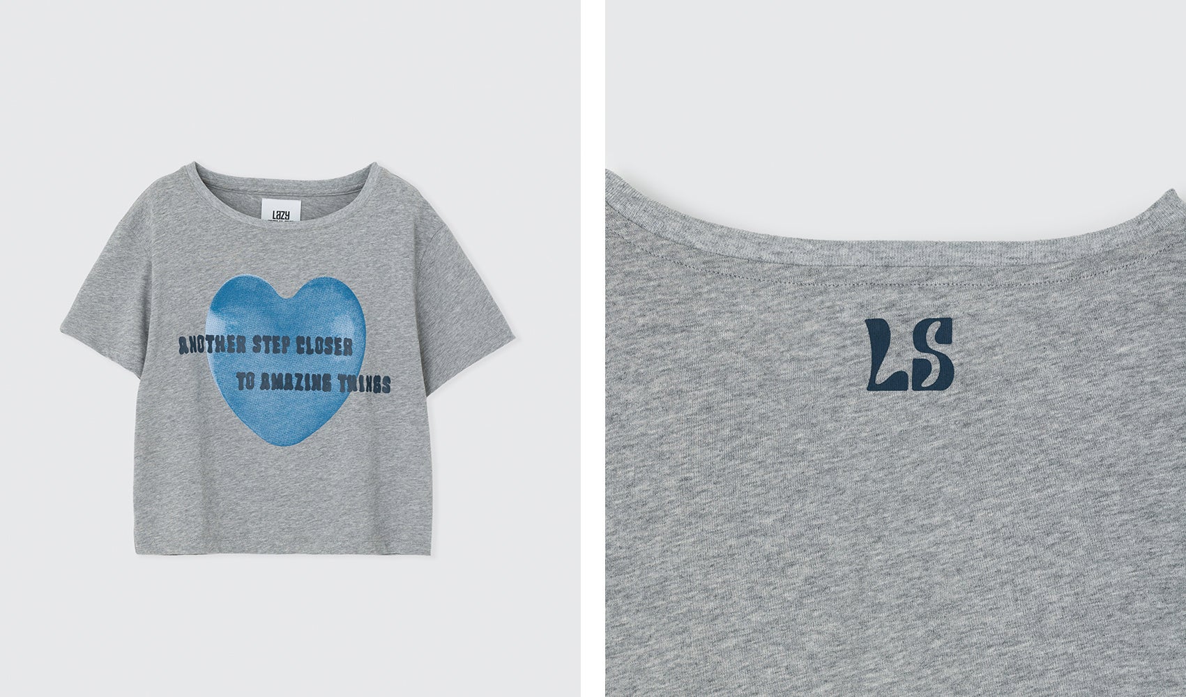 クロップドTシャツは、ヘルシーな丈感がこだわり。アッシュは「ANOTHER STEP CLOSER TO AMAZING THINGS」のメッセージをプリント。Lazy Stylesならではの、LAZYな一日をポジティブにスイッチしてくれるデザインです。